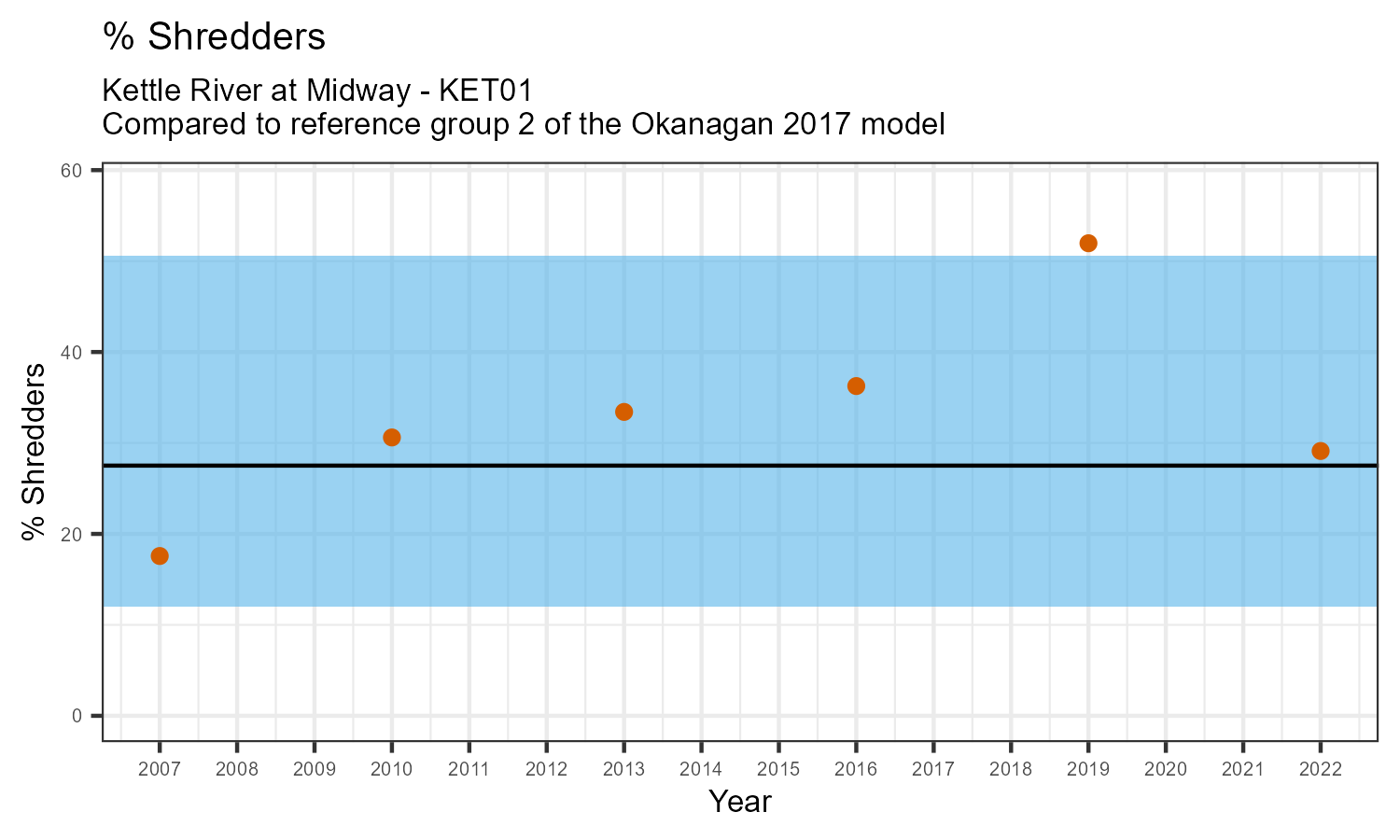 % Shredders is the proportion of taxonomic familes present that feed on leaf litter and other coarse particulate organic matter in the water. The proportion of shredders is expected to decrease at a site in response to disturbance.