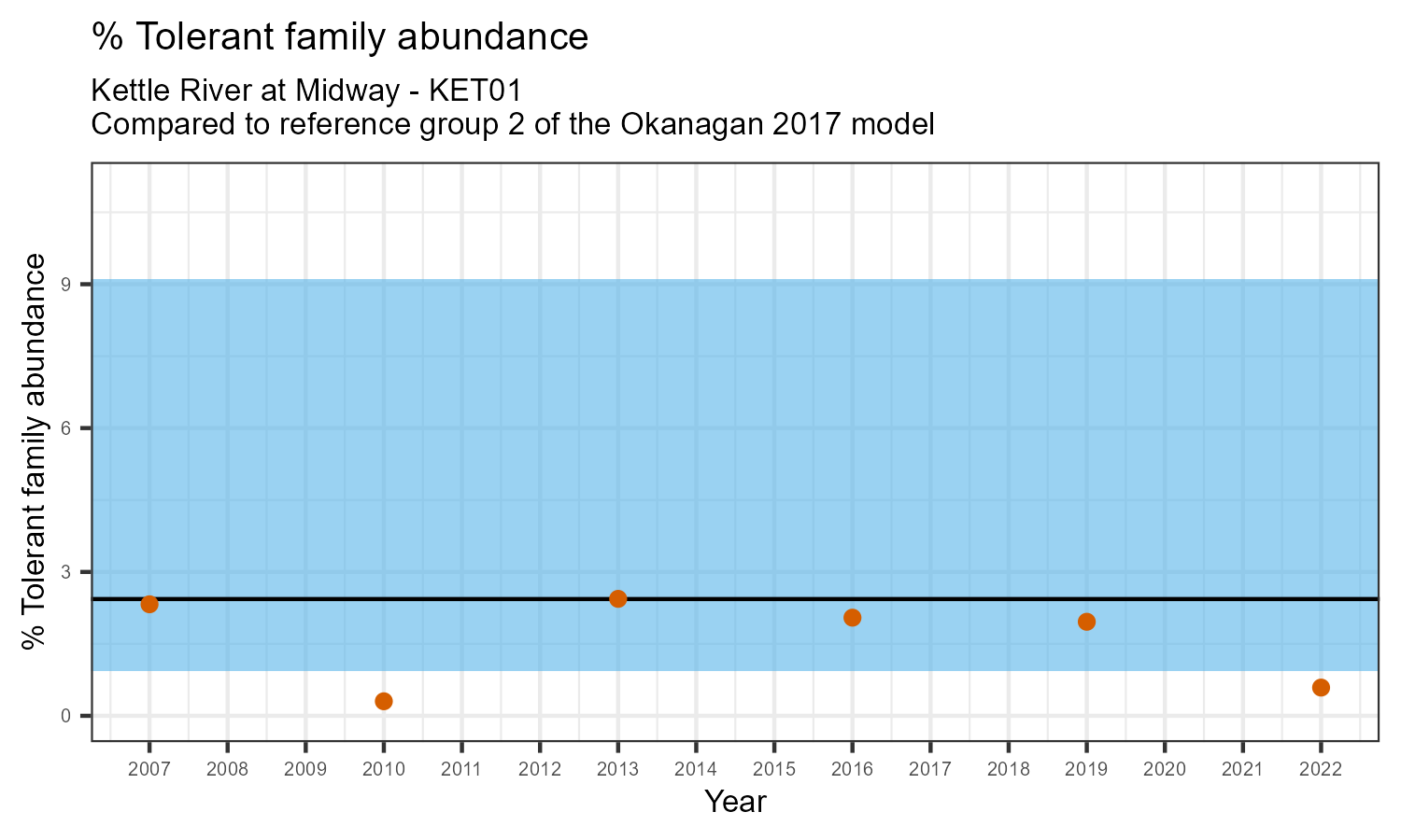% Tolerant family abundance is the proportion of taxonomic families that are tolerant to pollution, according to the Hilsenhoff Biotic Index. The % tolerant family abundance may increase as water pollution increases.