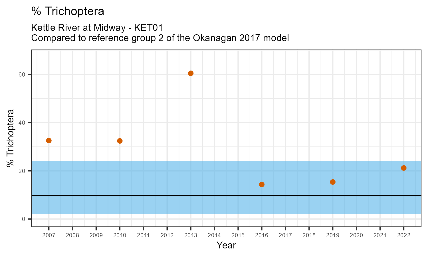 % Trichoptera is the proportion of invertebrates that belong to the taxonomic order Trichoptera. Trichoptera are commonly called caddisflies. They are sensitive to pollution. The % Trichoptera may decrease in response to habitat disturbances like poor water quality.