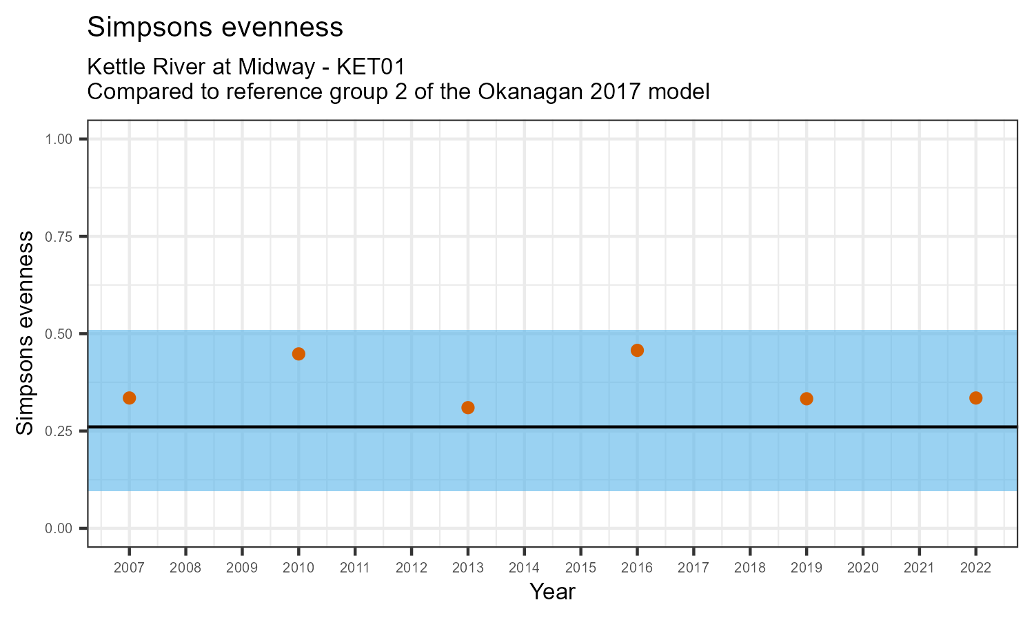 Simpson’s evenness is an index that measures whether the number of individuals in various taxonomic families is similar, or balanced. Balanced communities are an indicator of a healthy ecosystem. Simpson’s evenness may decrease in response to habitat disturbances.