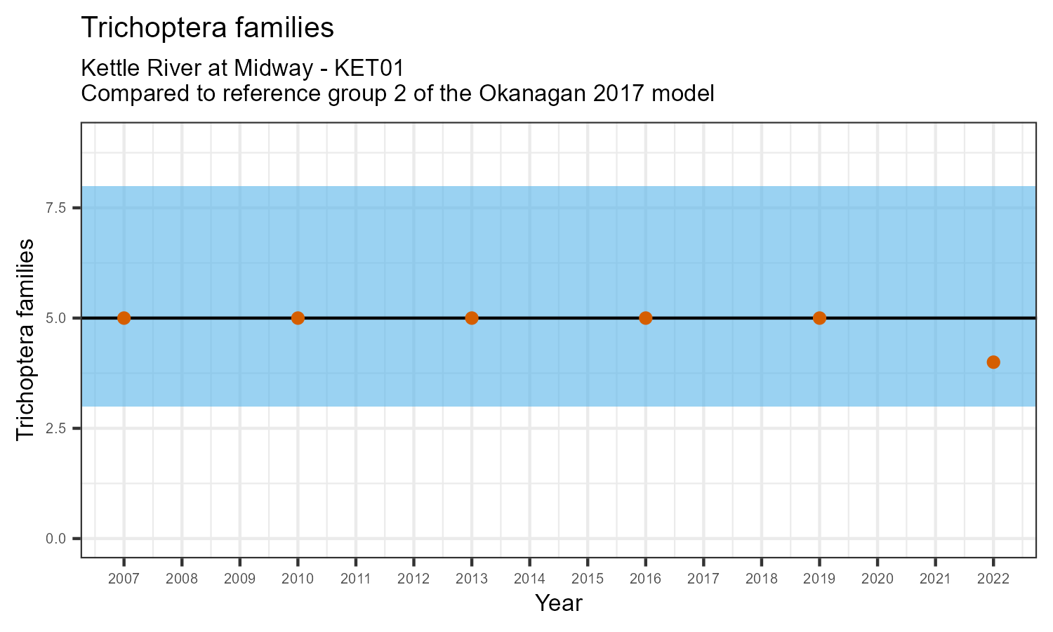 The number of families observed at this station was divided by the number of families found at more than half of similar reference sites. In 2022 the O:E ratio for this station was 0.82.