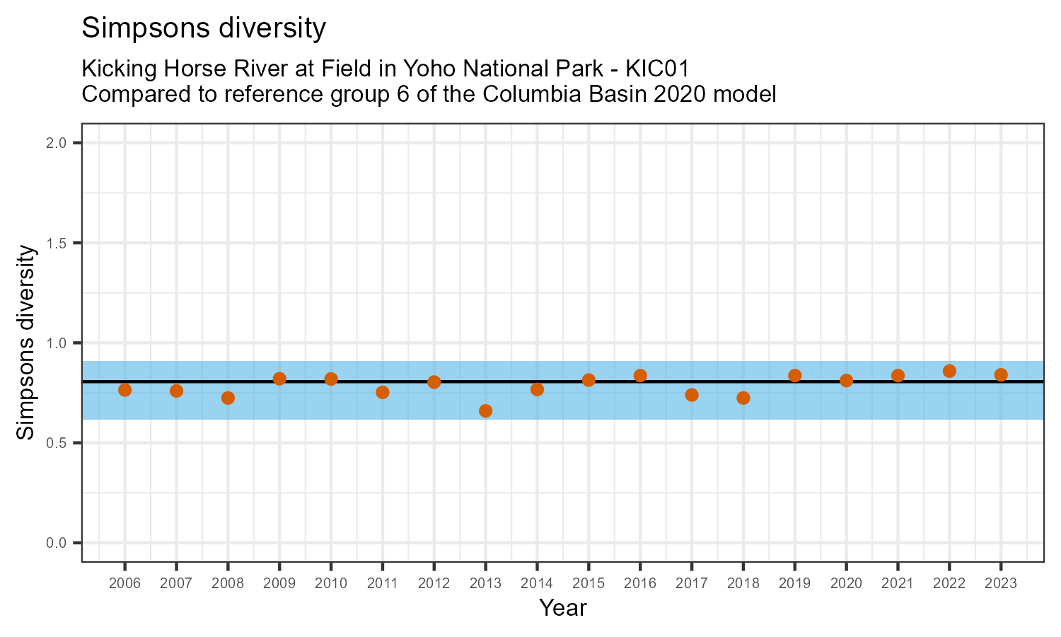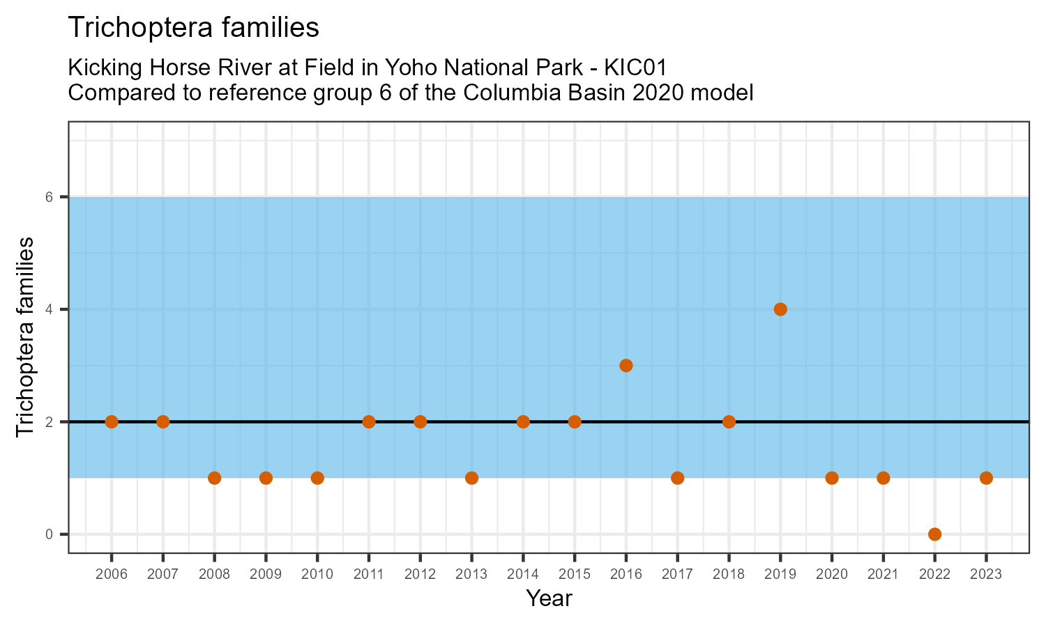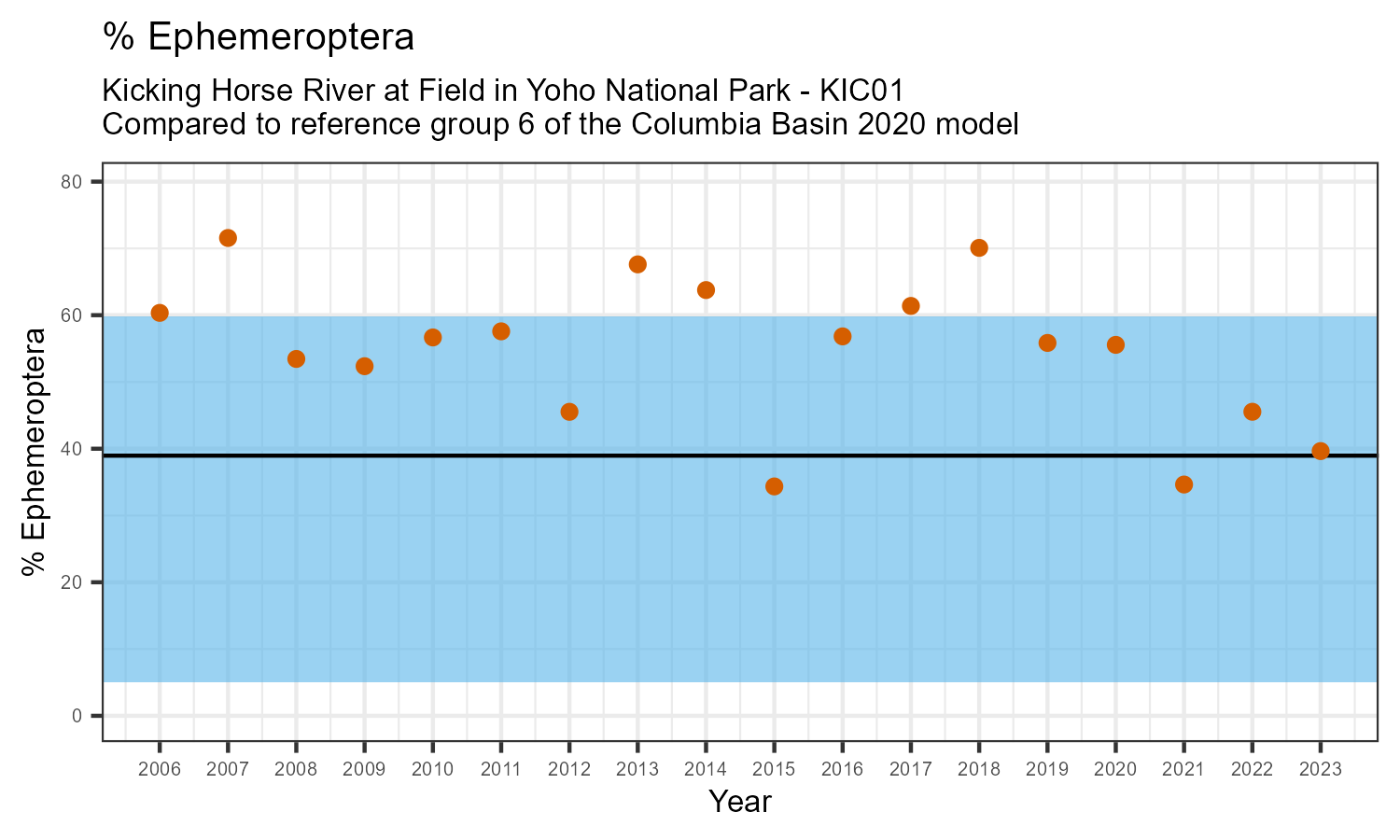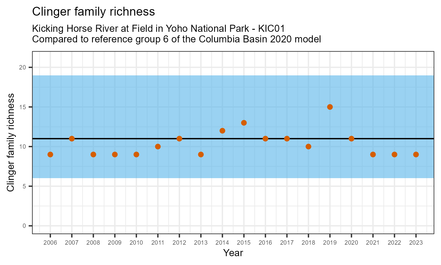 The biological condition at this station was assessed for 2023, the most recent year of sampling. The benthic macroinvertebrate community was analysed by comparing it to similar sites in a CABIN reference model for the Columbia River basin.