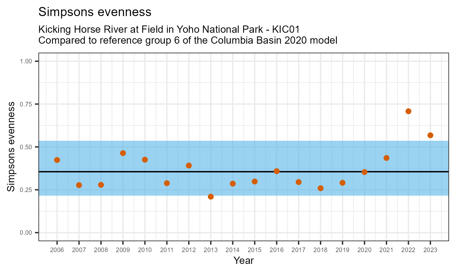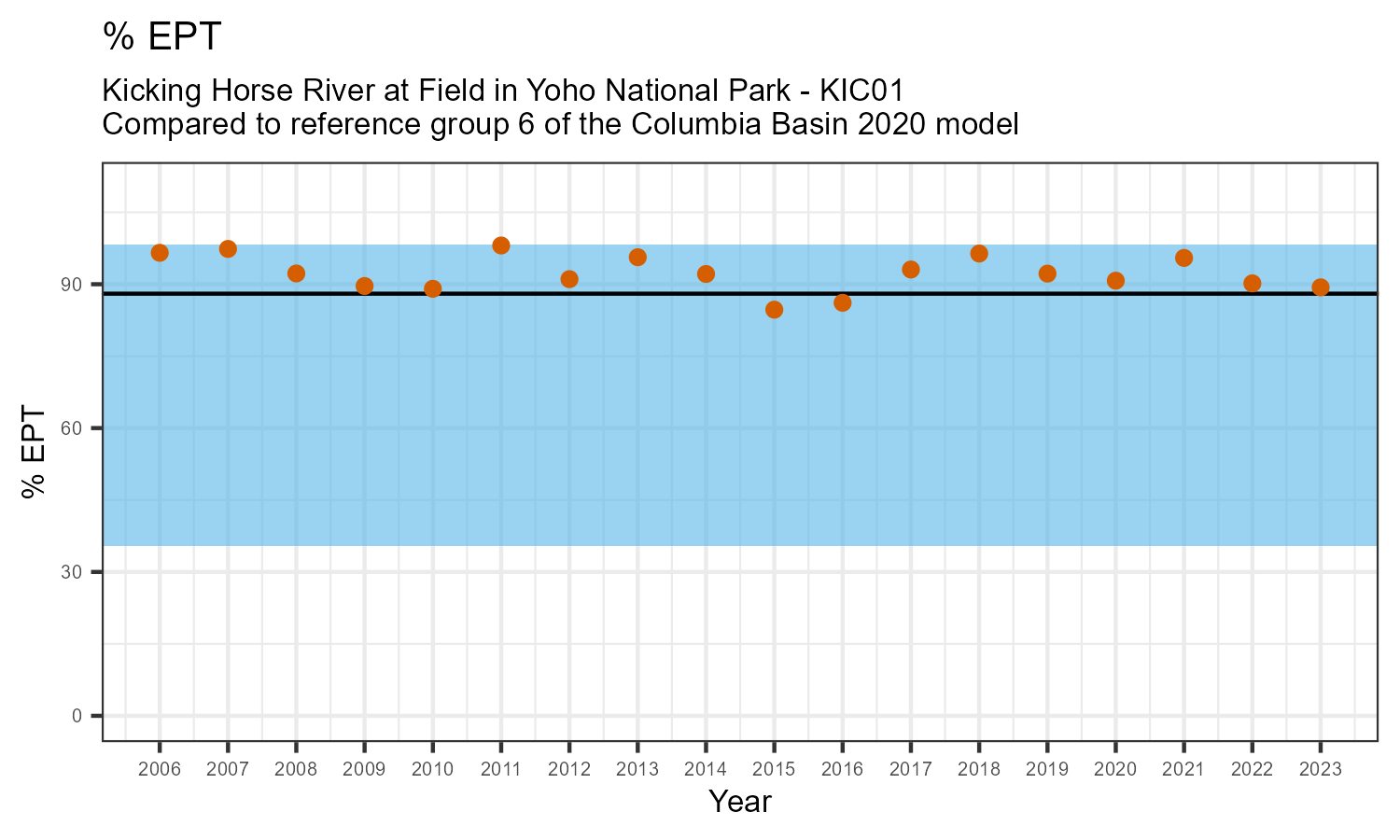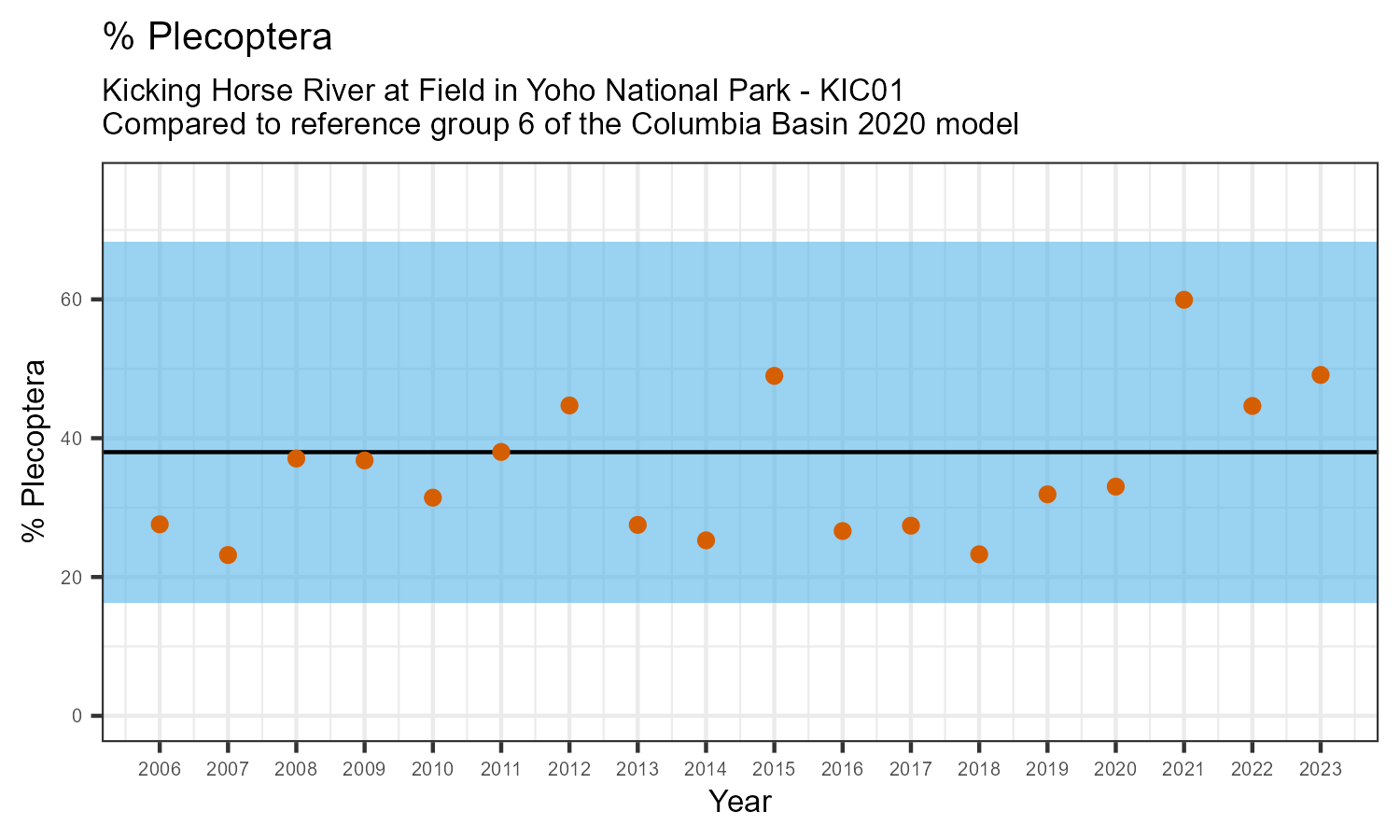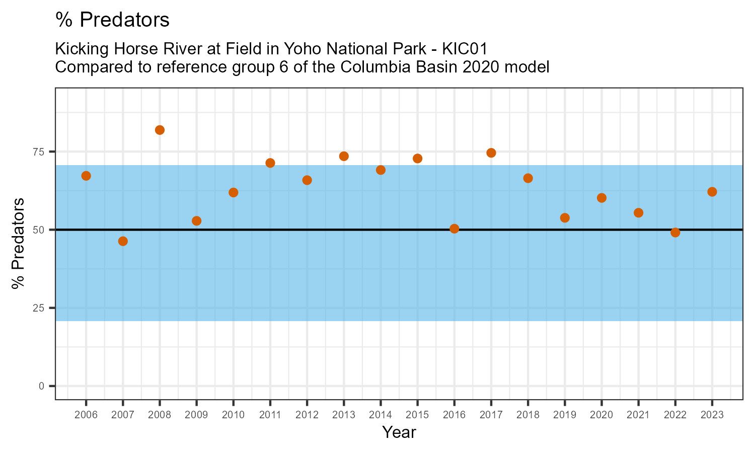 The biological condition at this station was assessed for 2023, the most recent year of sampling. The benthic macroinvertebrate community was analysed by comparing it to similar sites in a CABIN reference model for the Columbia River basin.