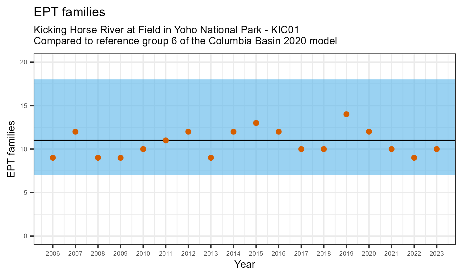 EPT family richness is measured by counting how many taxonomic families belong to one of the pollution sensitive EPT orders: Ephemeroptera (mayflies), Plecoptera (stoneflies), or Trichoptera (caddisflies). EPT family richness may decrease in response to habitat disturbances like poor water quality.