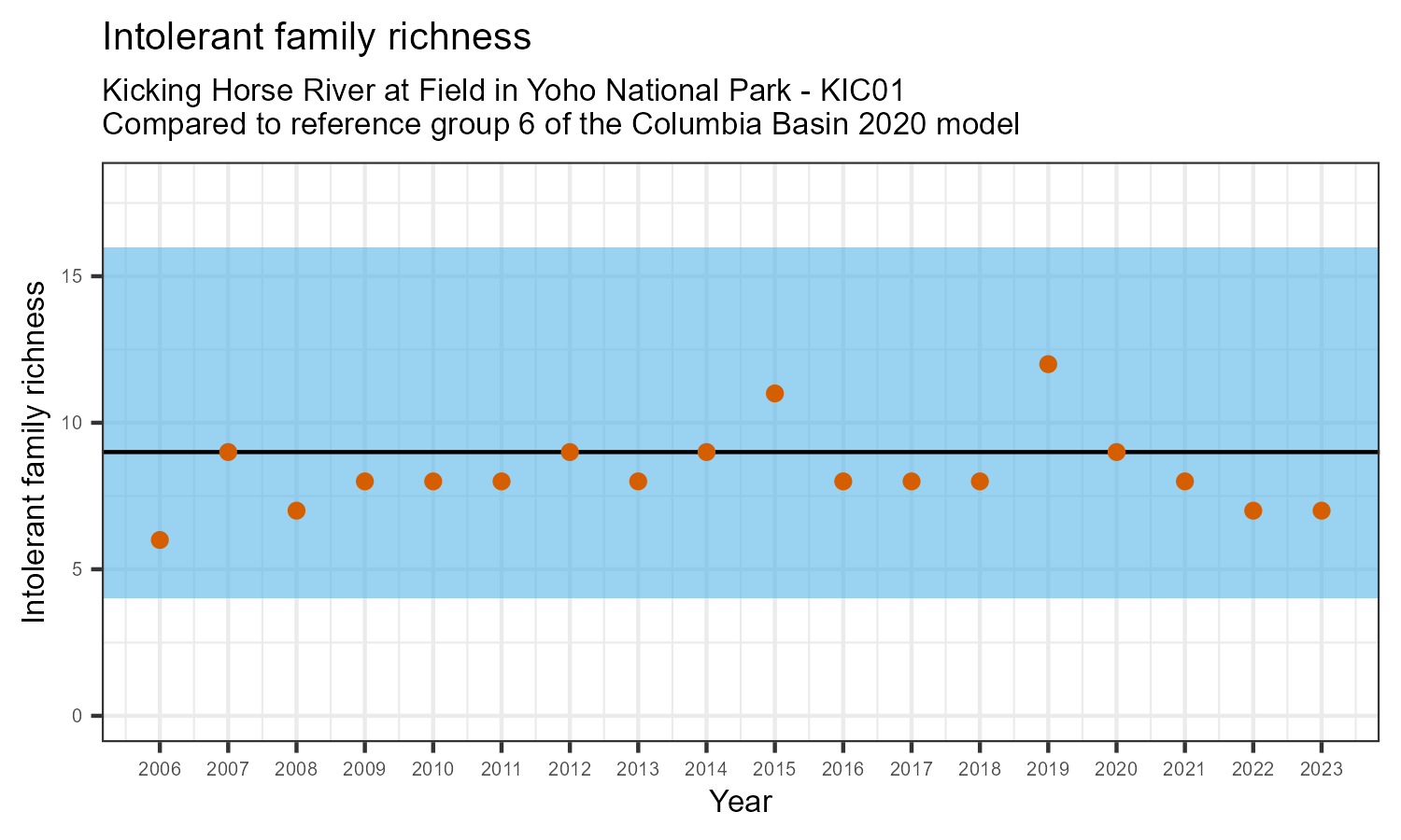 Intolerant family richness counts the number of taxonomic families that are sensitive (intolerant) to pollution, according to the Hilsenhoff Biotic Index. Intolerant family richness may decrease as water pollution increases.