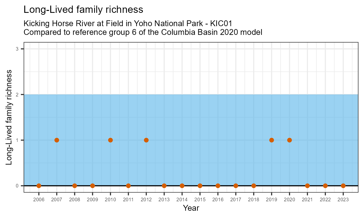 Long-lived family richness counts the number of taxonomic families that need more than 1 year to complete their life cycle. These families have been exposed to conditions in the water over a longer period. They provide information on historical and current water quality conditions. The number of long-lived families may decrease in response to habitat disturbances like poor water quality.