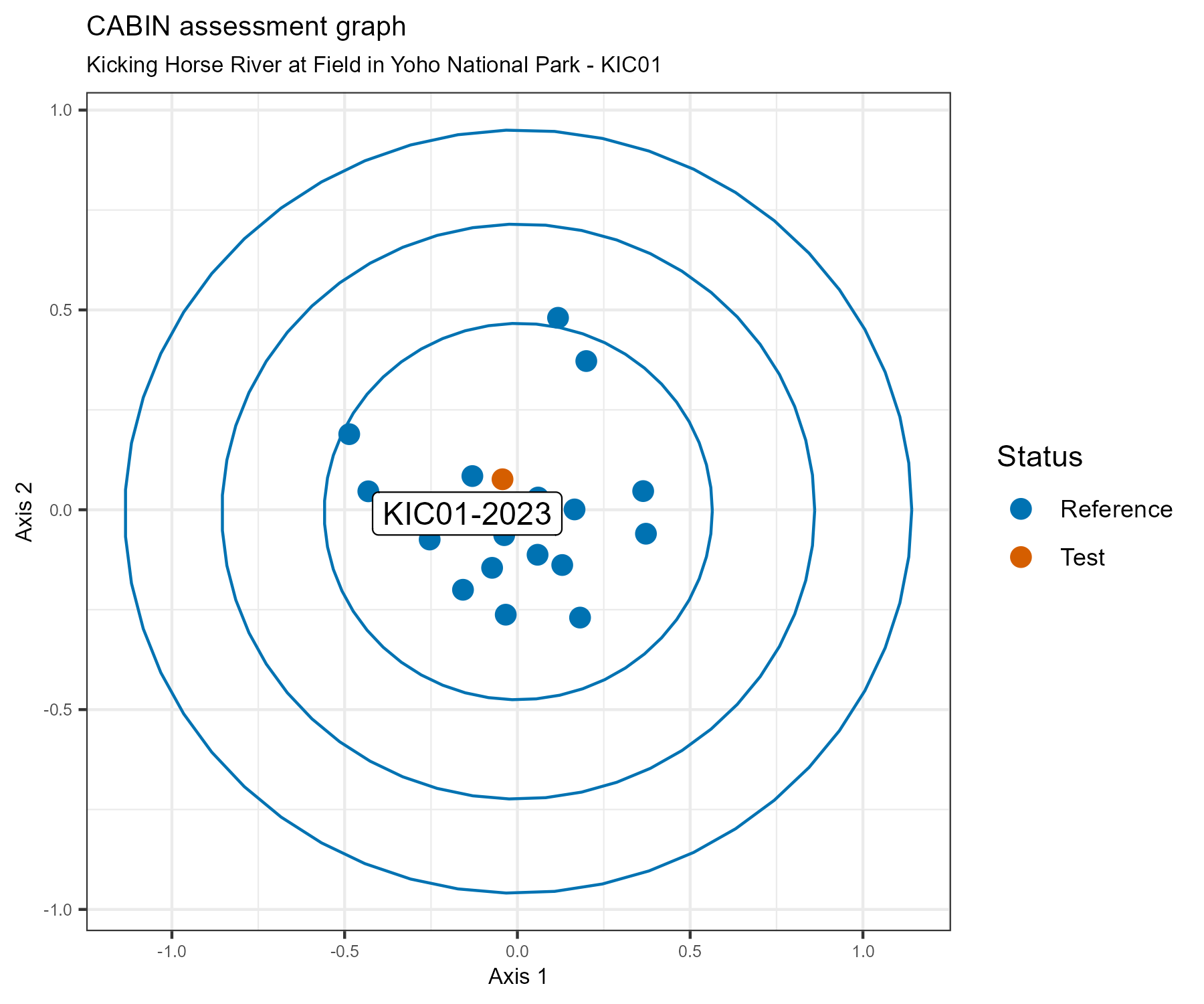 A CABIN assessment considers this water quality monitoring station the “test” site, and compares it to a group of sites with similar habitat features from the Columbia Basin 2020 CABIN reference model. Sites in the reference model have little or no human activity in their watersheds, so they are considered to represent pristine or best possible biological conditions. If the test site is close to the reference sites on the plot, it is also considered to be in good biological condition.