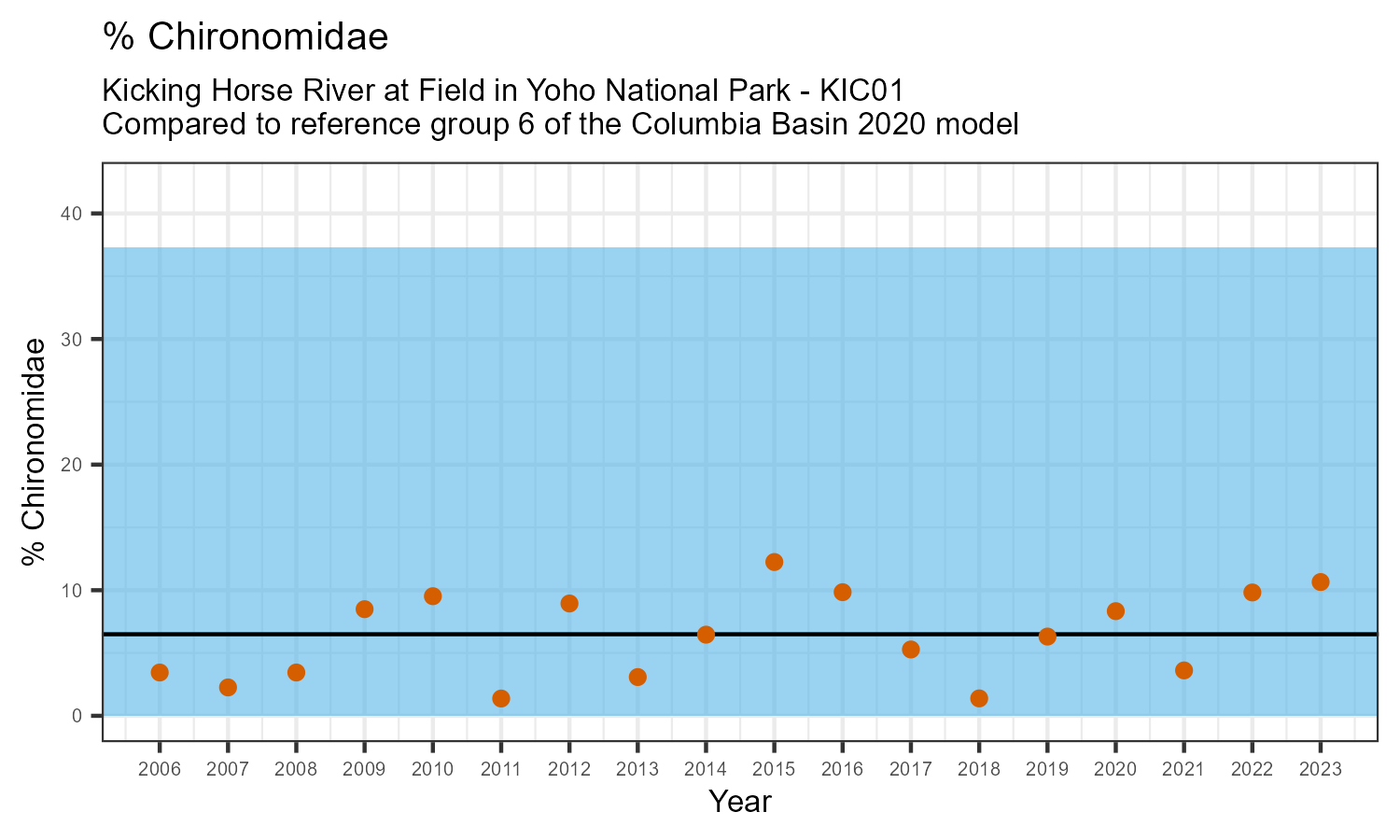 % Chironomidae is the proportion of invertebrates that belong to the taxonomic family Chironomidae. Chironomidae are non-biting midges and are often the most abundant family in a stream. Their pollution tolerance varies widely between different species.