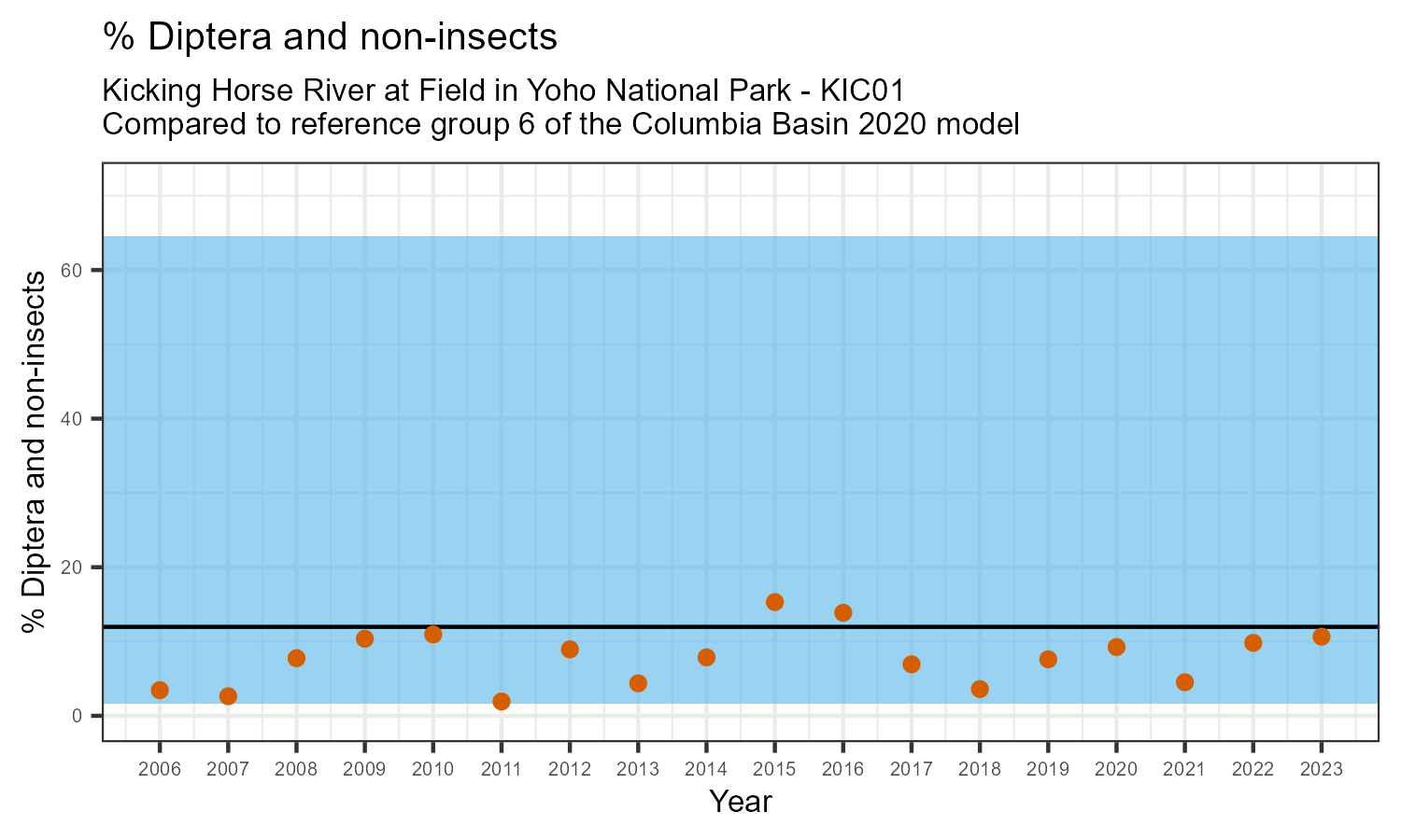 % Diptera and non-insects is the proportion of invertebrates that either are not insects, or are insects in the taxonomic order Diptera. Diptera are flies, and along with non-insects they represent the more pollution tolerant members of the aquatic community. The % Diptera and non-insects may increase in response to habitat disturbances like poor water quality.