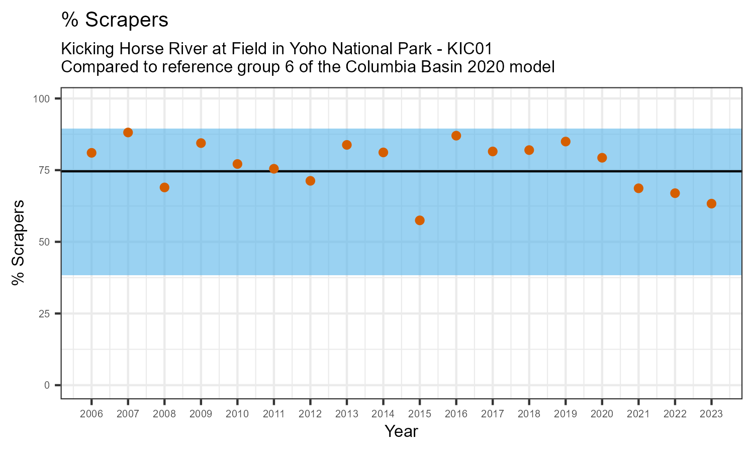 % Scrapers is the proportion of taxonomic familes present that feed by grazing on the algae growing on rocks and other underwater surfaces. The proportion of scrapers is expected to decrease at a site in response to disturbance.