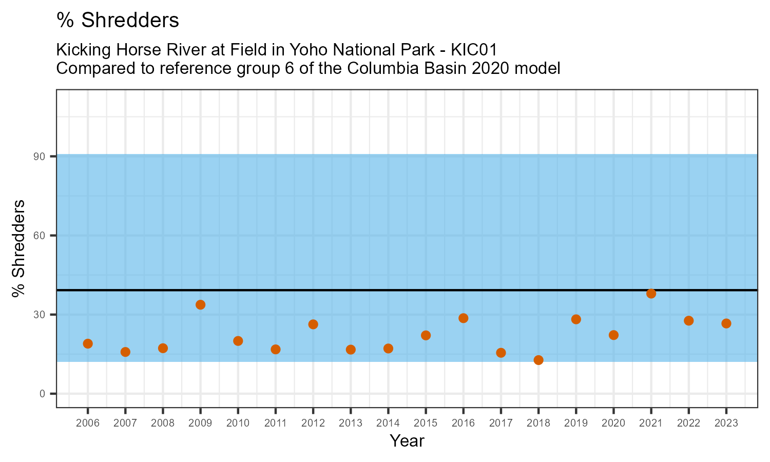 % Shredders is the proportion of taxonomic familes present that feed on leaf litter and other coarse particulate organic matter in the water. The proportion of shredders is expected to decrease at a site in response to disturbance.
