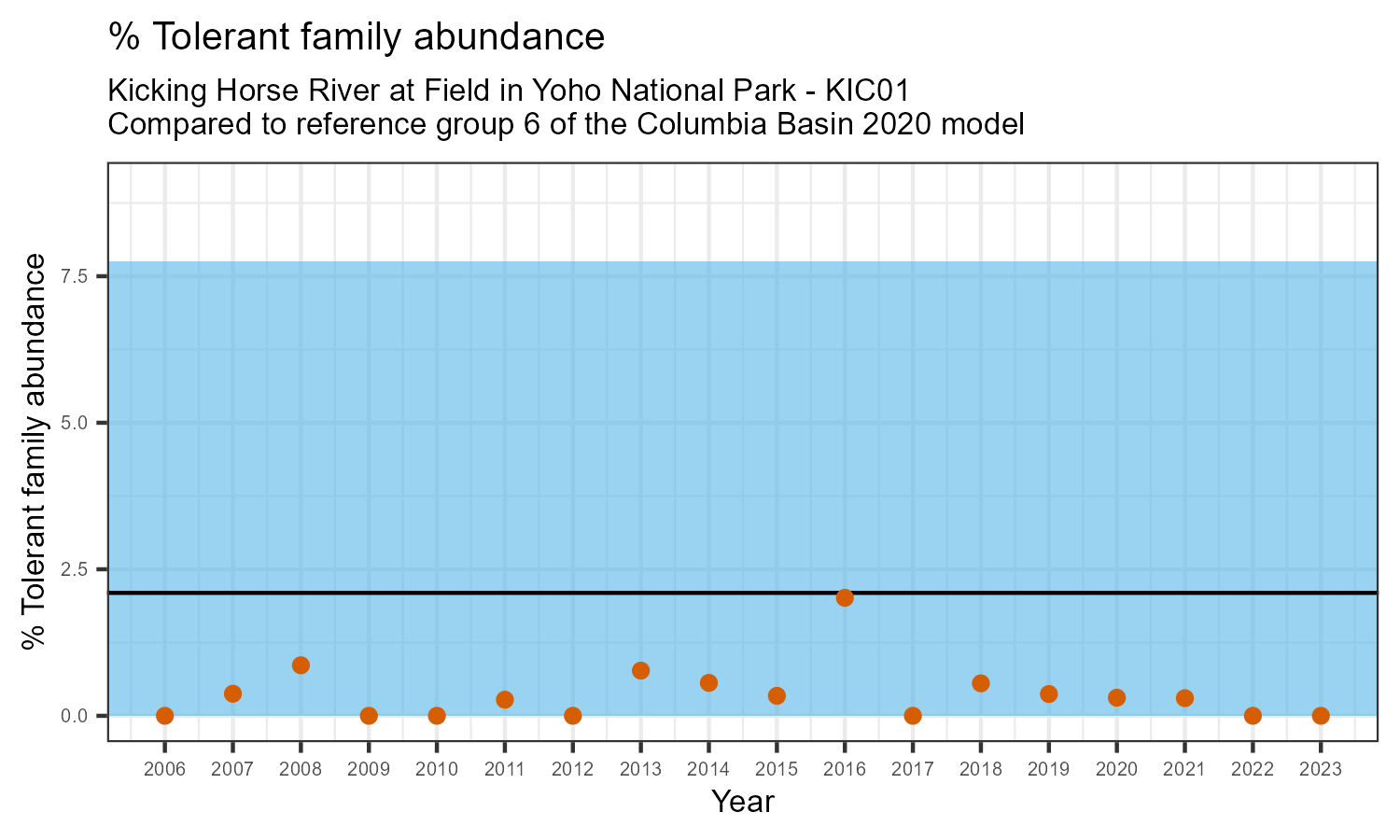 % Tolerant family abundance is the proportion of taxonomic families that are tolerant to pollution, according to the Hilsenhoff Biotic Index. The % tolerant family abundance may increase as water pollution increases.