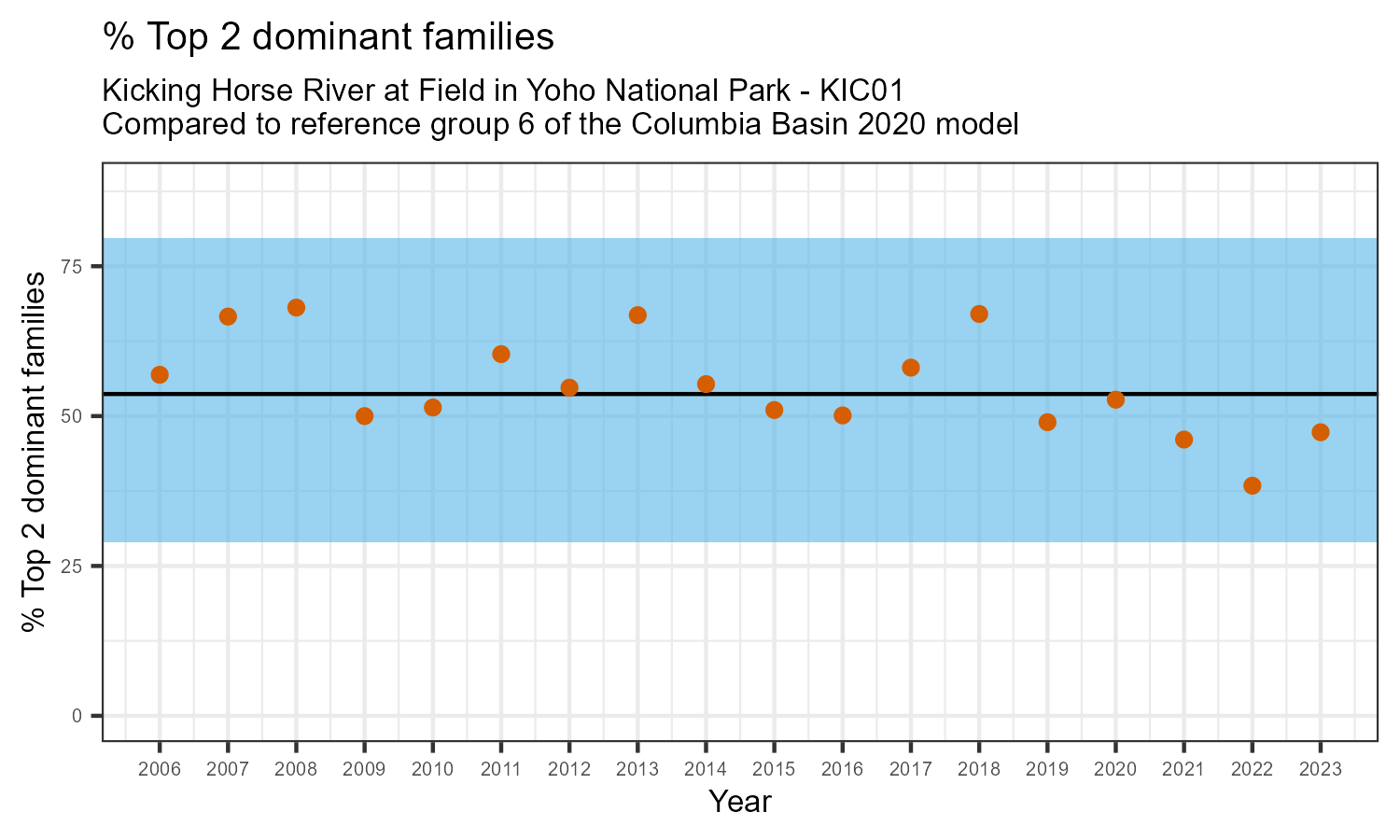 % Top 2 dominant families is the proportion of the total sample represented by the two most abundant families of invertebrates. A healthy aquatic community should have a balance of many types of invertebrates. If only one or two families dominate the community, this can be a sign of habitat disturbance. The percentage of the two most dominant families in the community may increase in response to disturbance.