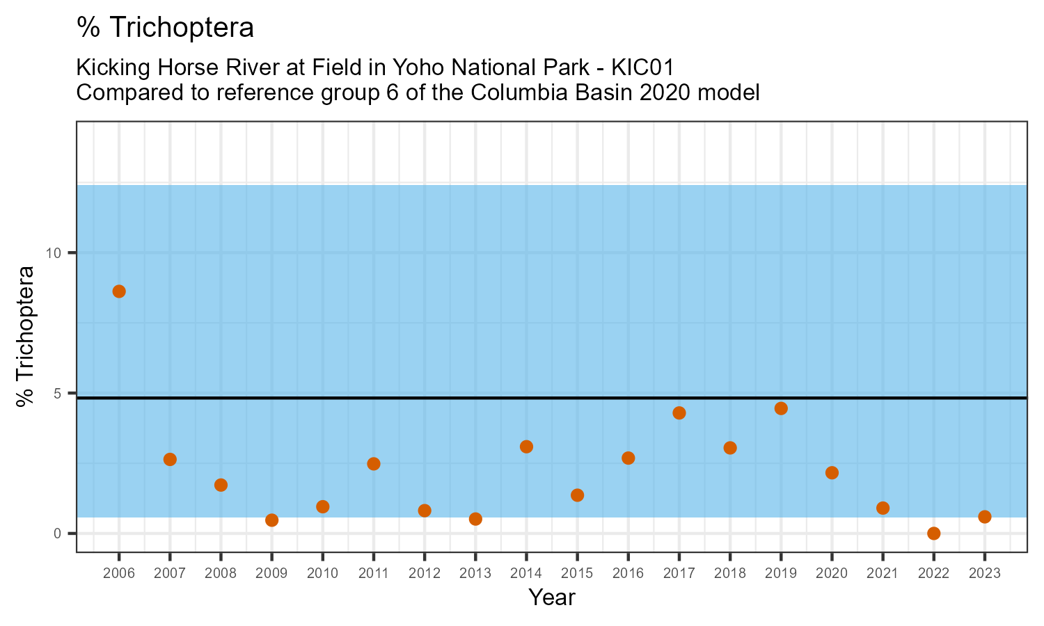 % Trichoptera is the proportion of invertebrates that belong to the taxonomic order Trichoptera. Trichoptera are commonly called caddisflies. They are sensitive to pollution. The % Trichoptera may decrease in response to habitat disturbances like poor water quality.