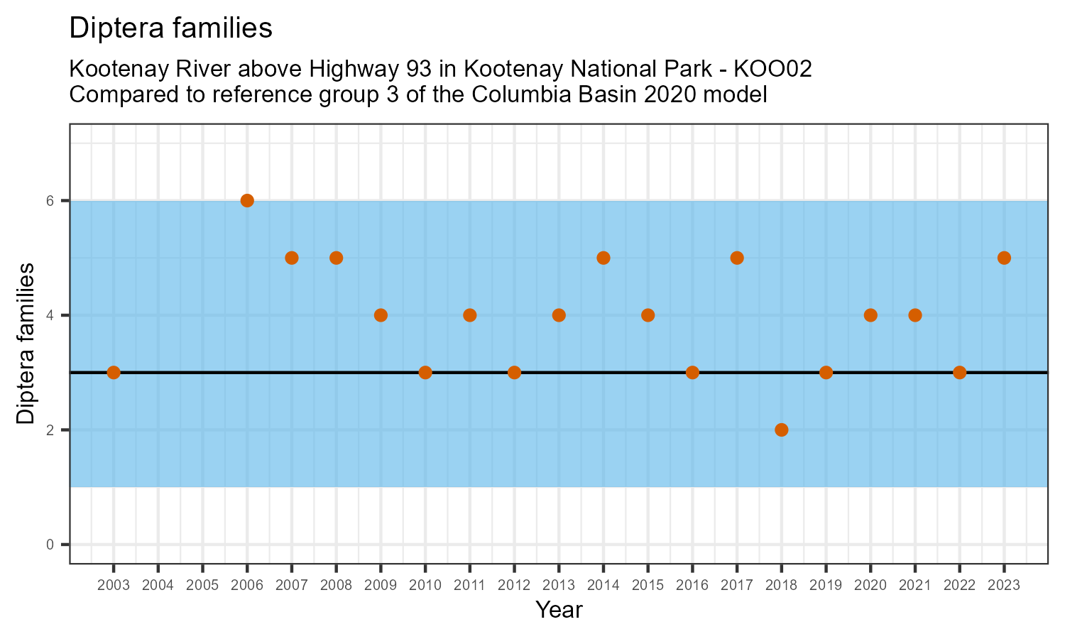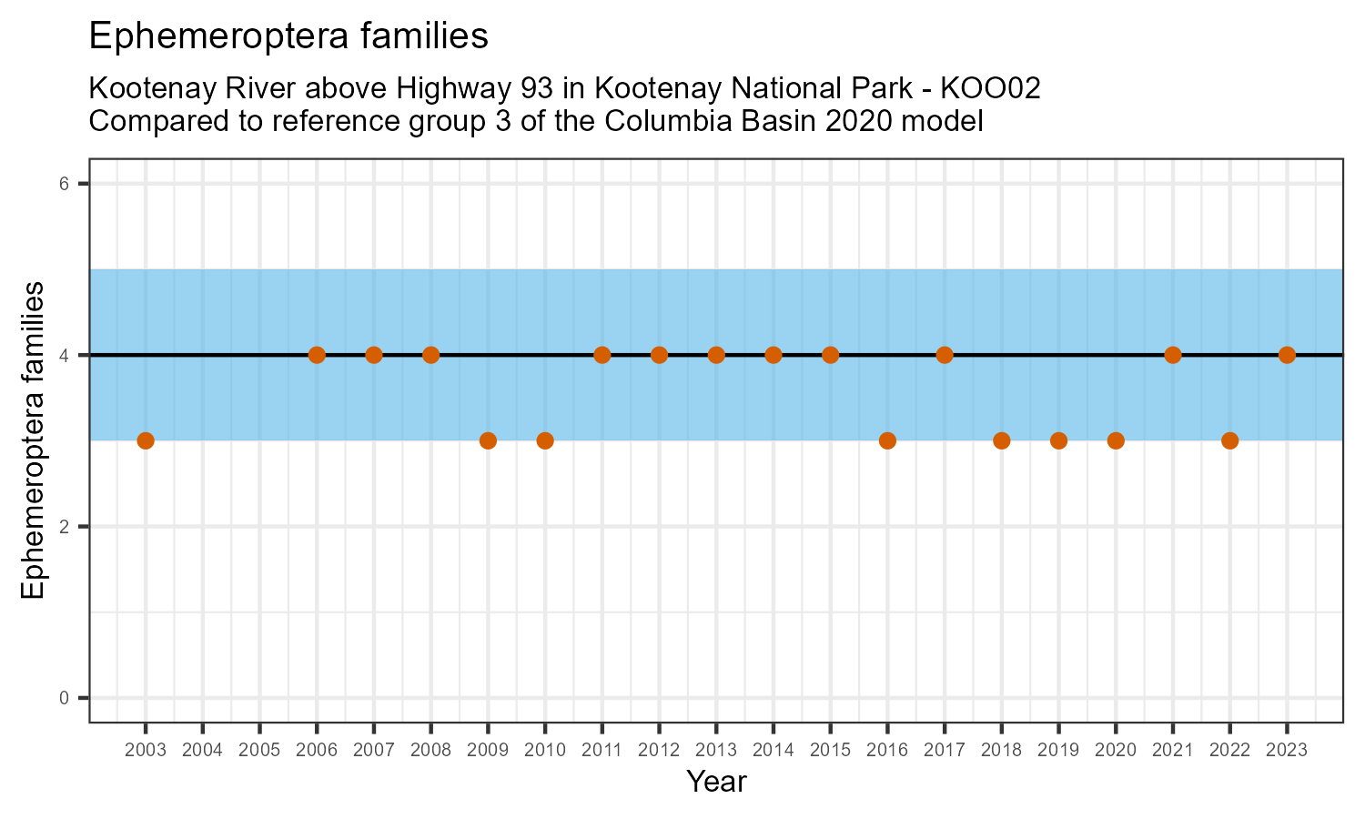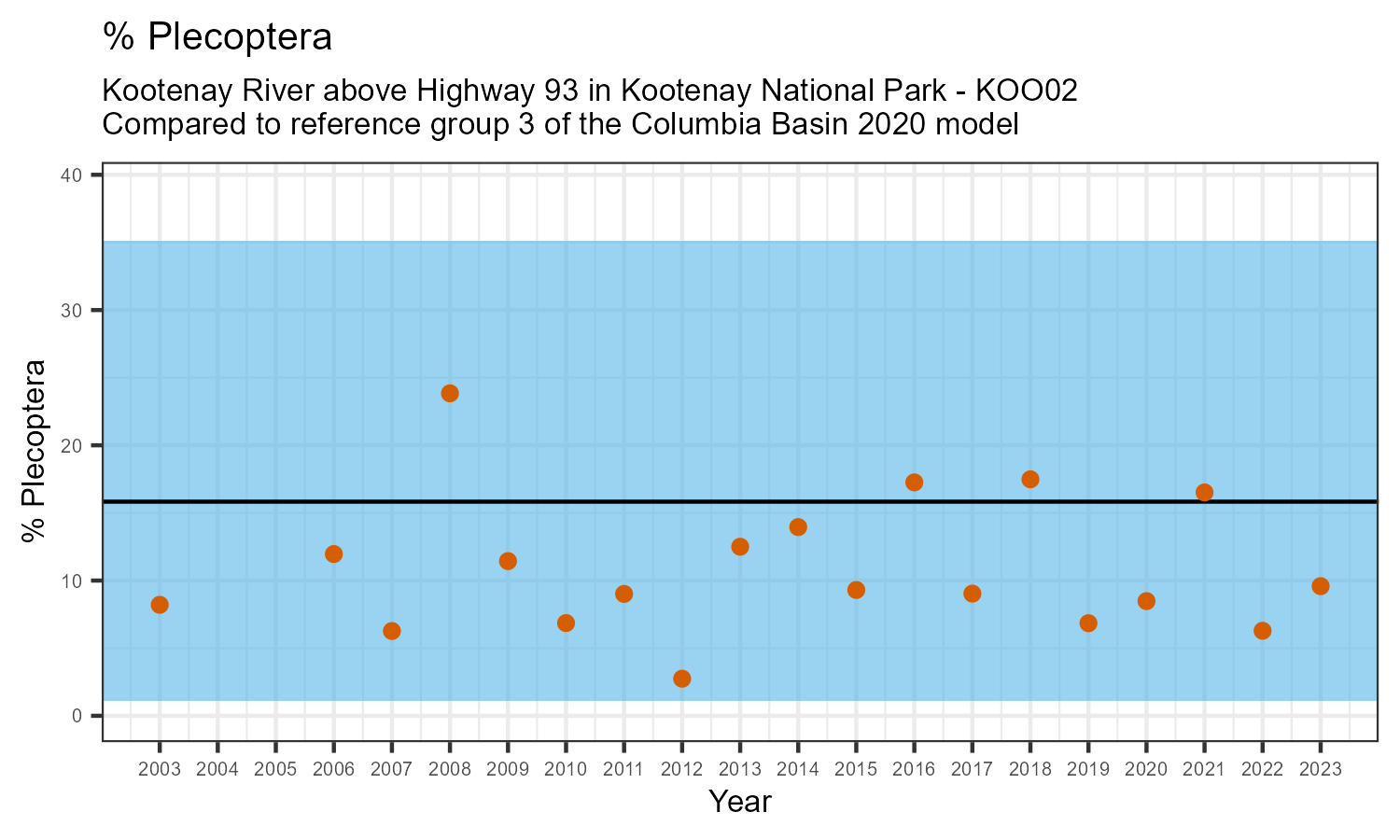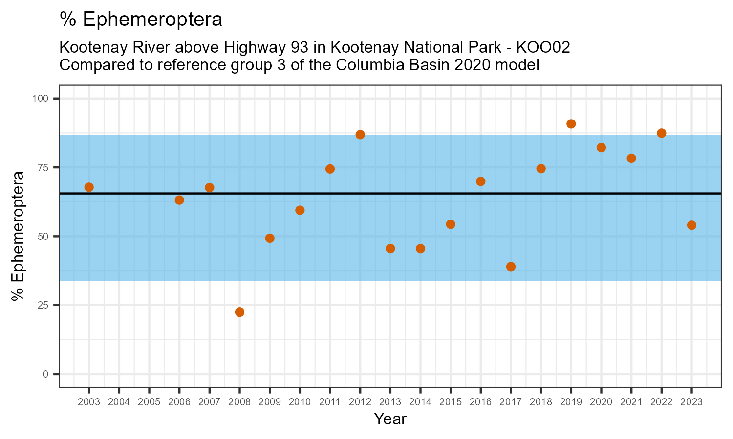 Kootenay River above Highway 93 in Kootenay National Park is a reference site. Samples from this site are used to update CABIN reference models for the Columbia River basin. Benthic macroinvertebrate community metrics were summarized for the most recent year of sampling (2023) and compared to similar reference sites in the Columbia Basin 2020 reference model.