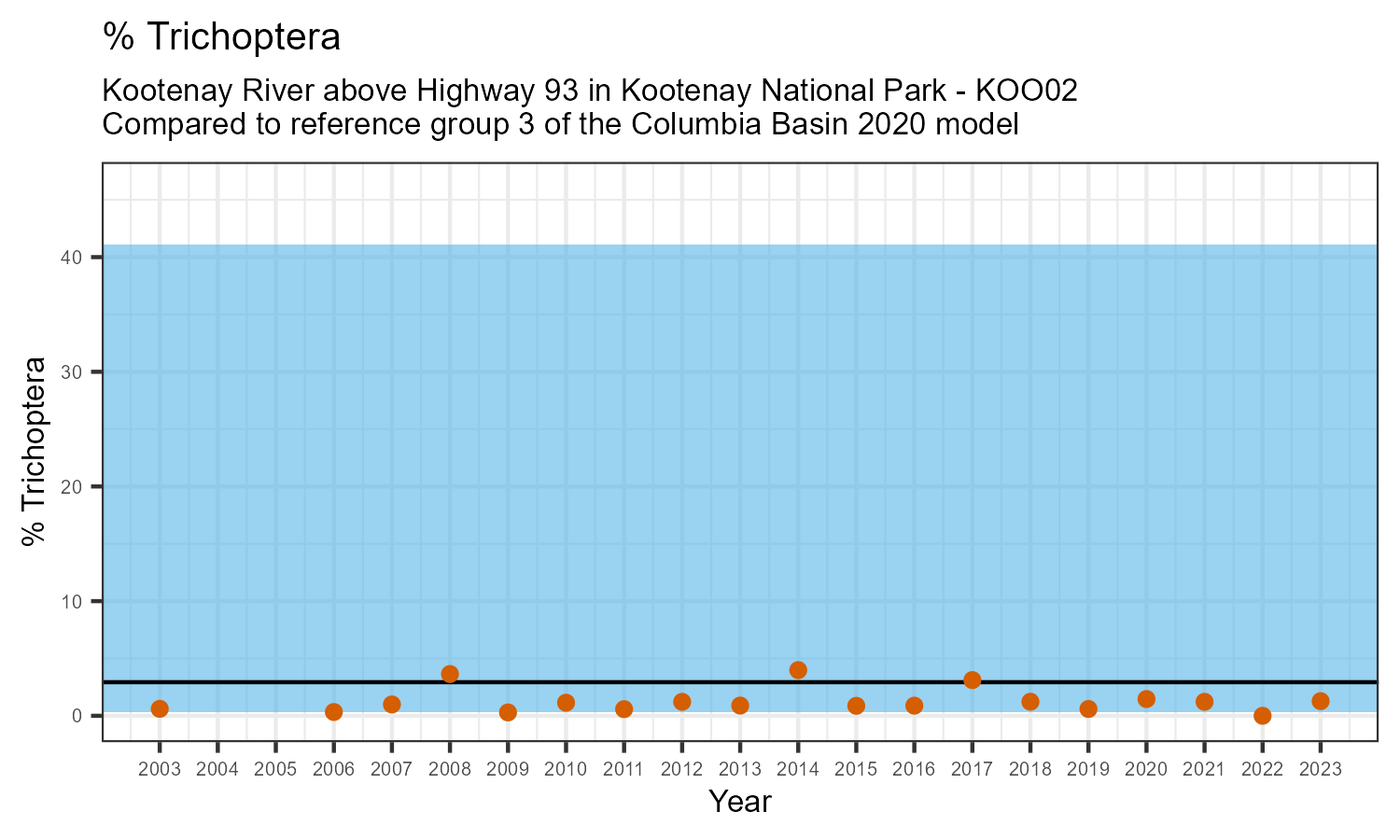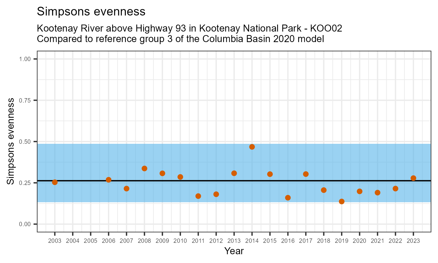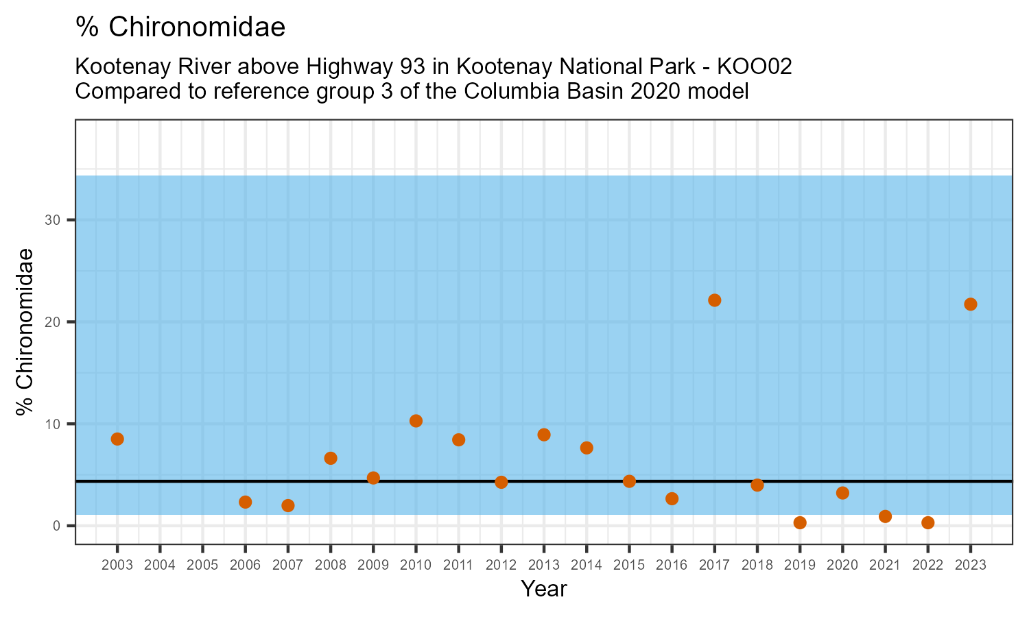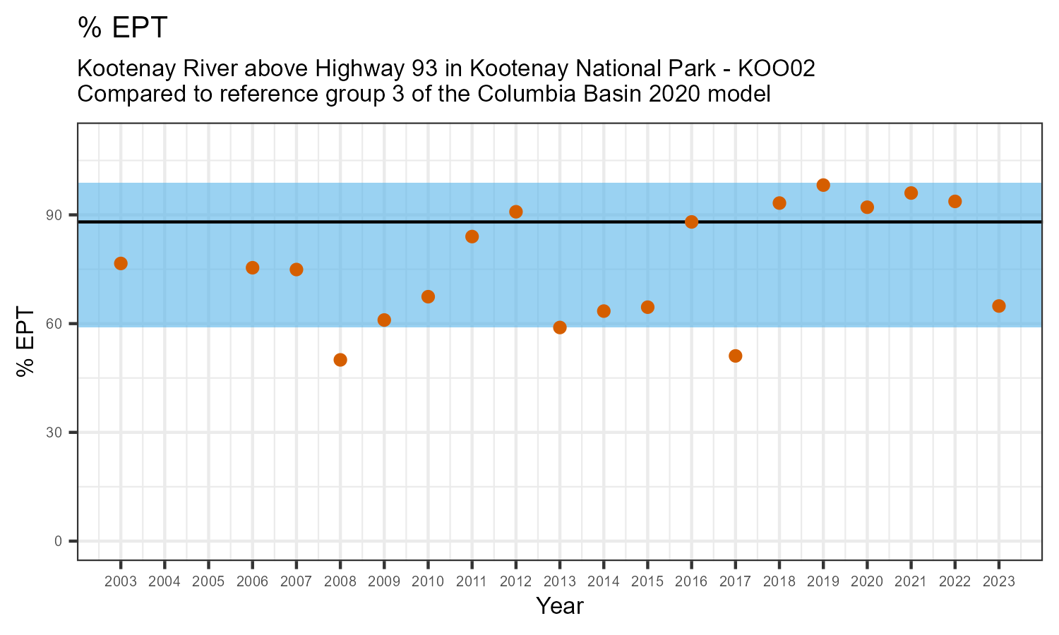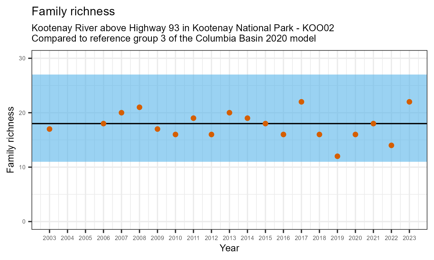 Kootenay River above Highway 93 in Kootenay National Park is a reference site. Samples from this site are used to update CABIN reference models for the Columbia River basin. Benthic macroinvertebrate community metrics were summarized for the most recent year of sampling (2023) and compared to similar reference sites in the Columbia Basin 2020 reference model.