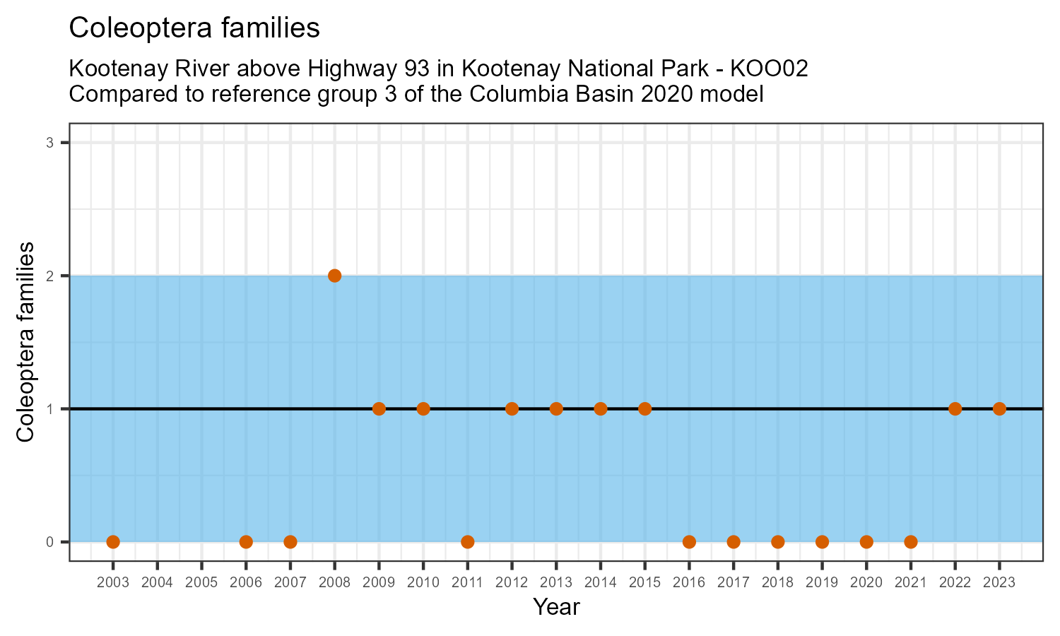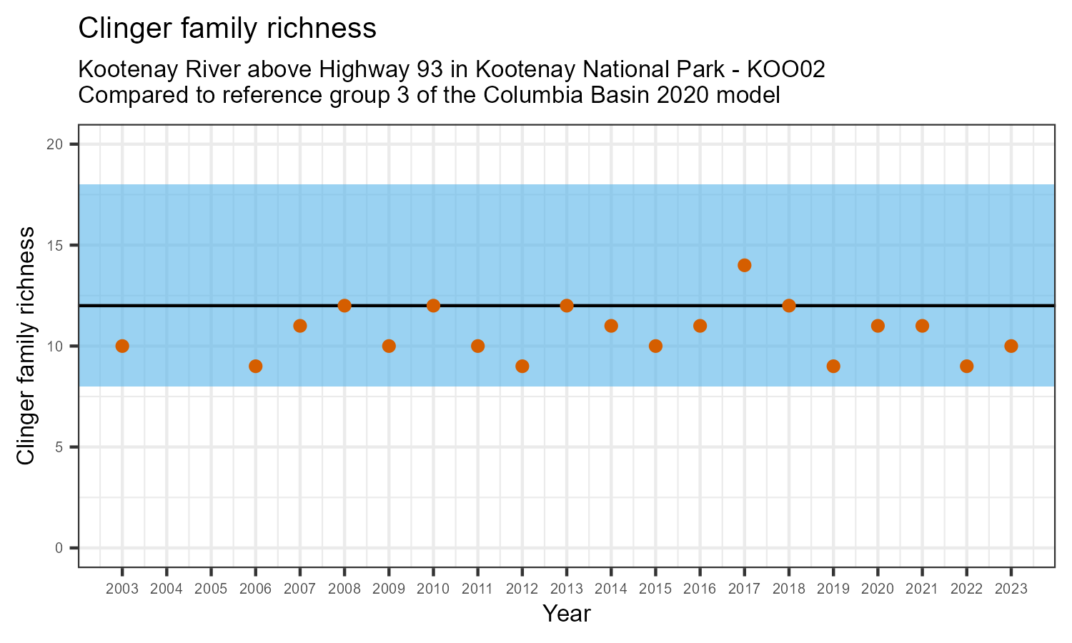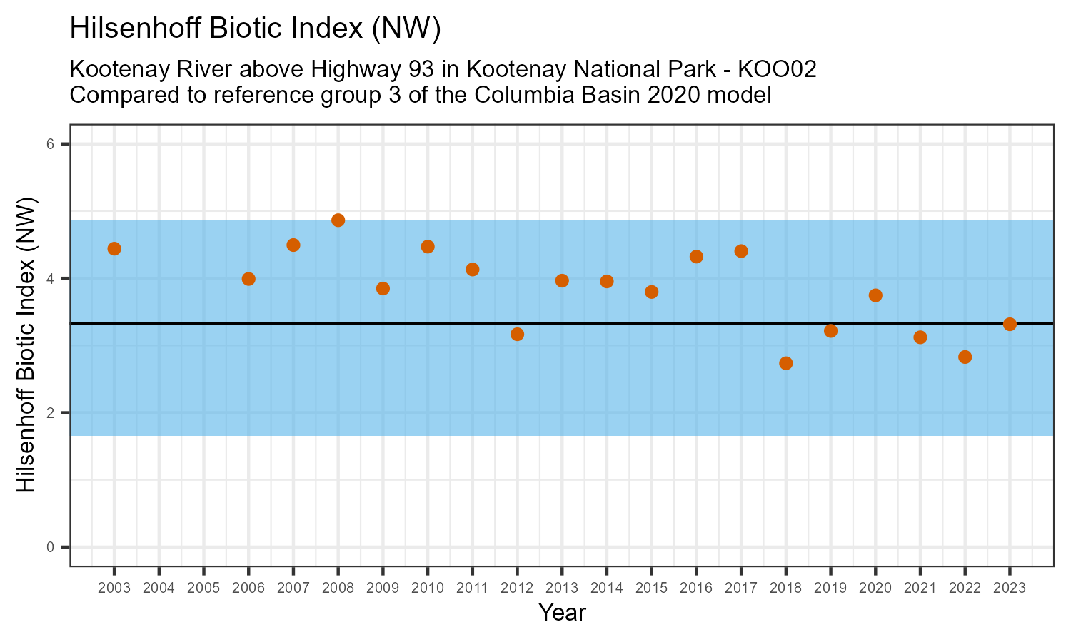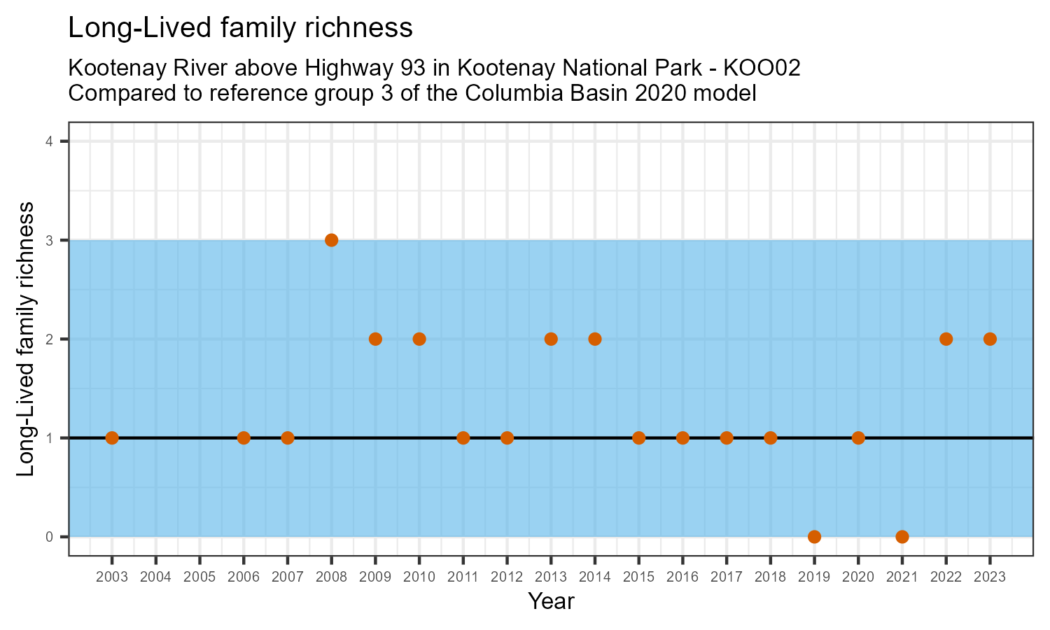 Kootenay River above Highway 93 in Kootenay National Park is a reference site. Samples from this site are used to update CABIN reference models for the Columbia River basin. Benthic macroinvertebrate community metrics were summarized for the most recent year of sampling (2023) and compared to similar reference sites in the Columbia Basin 2020 reference model.