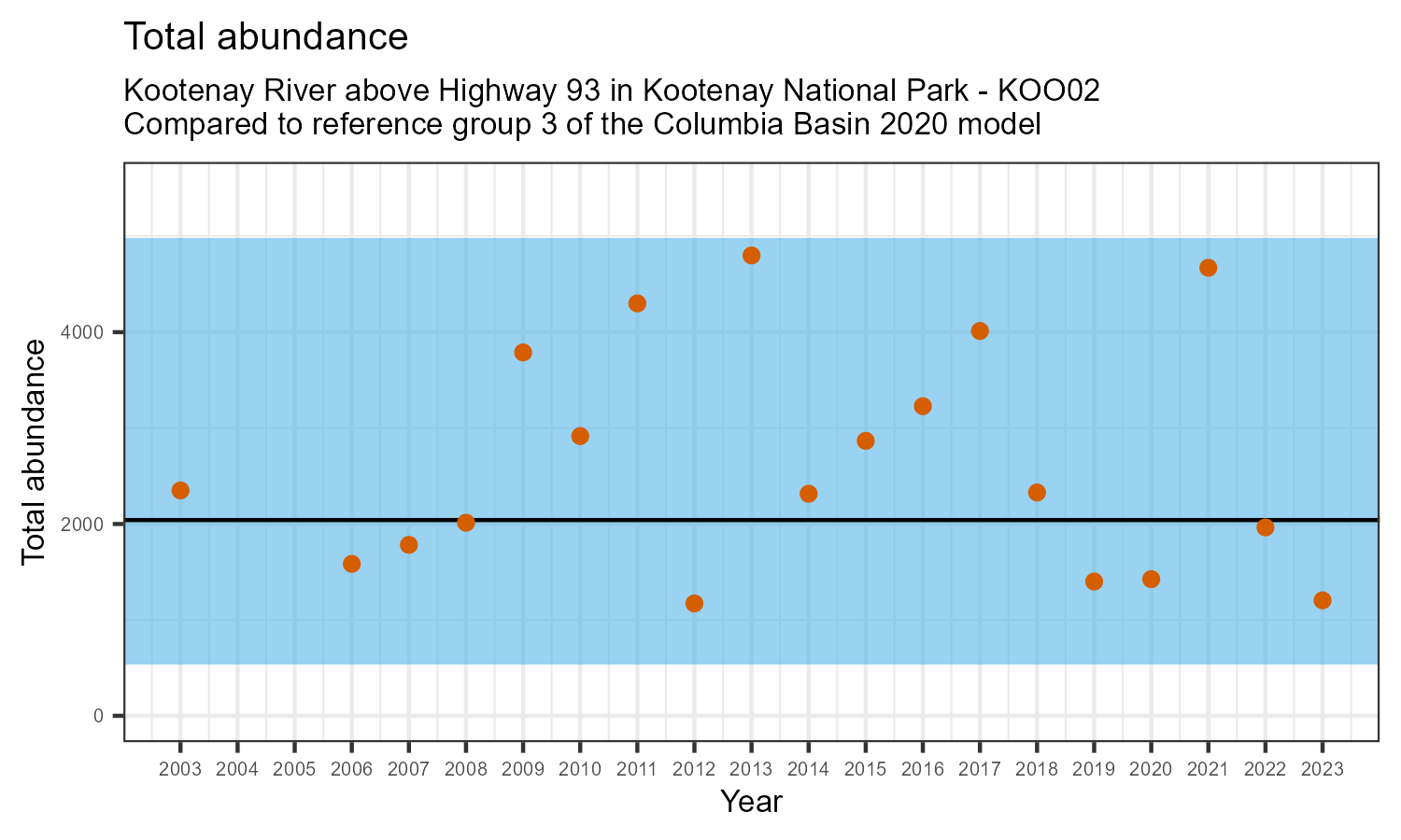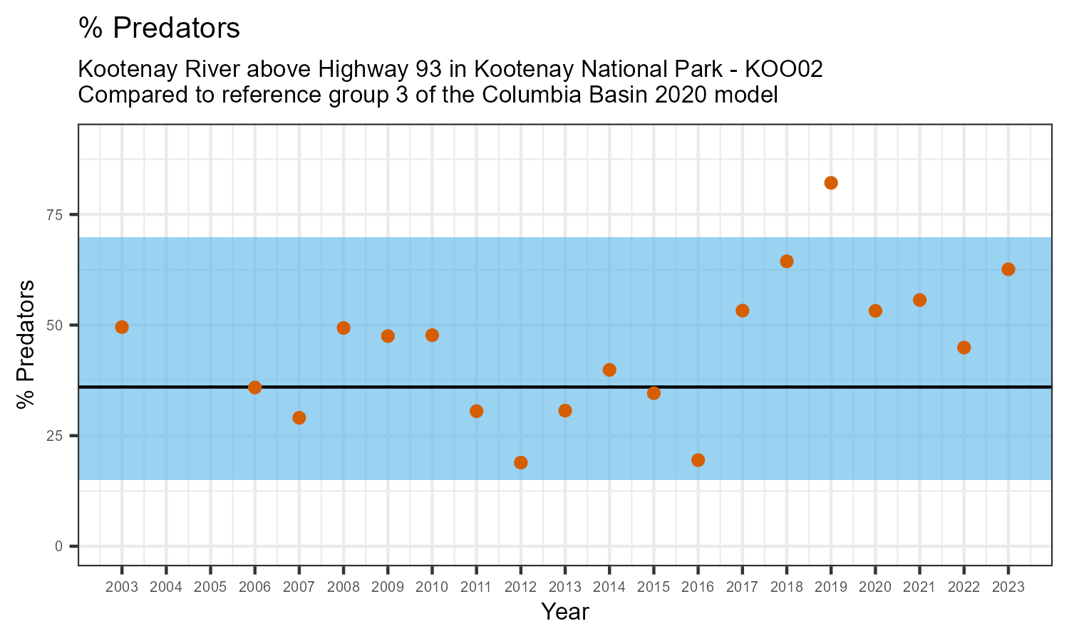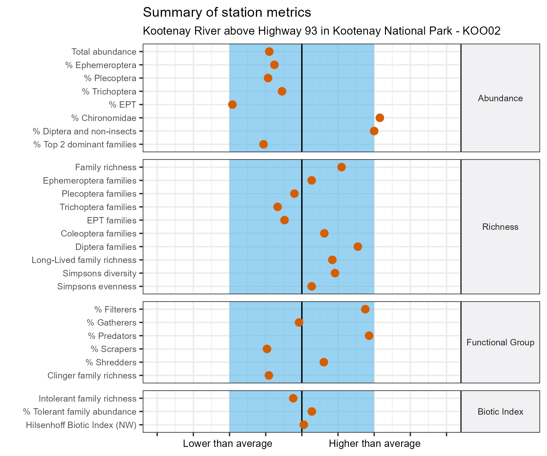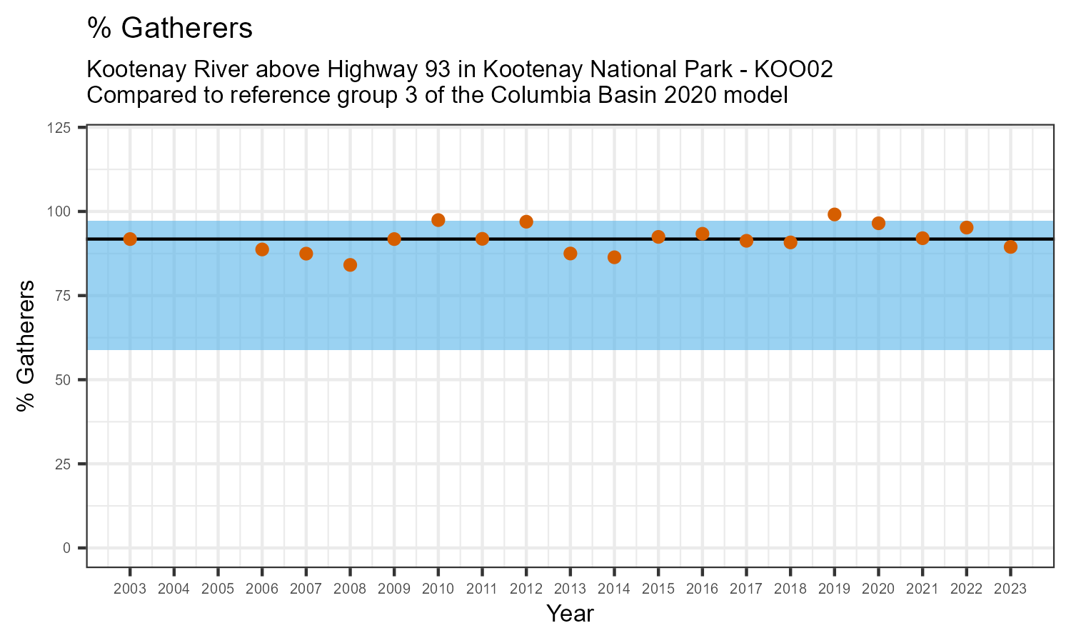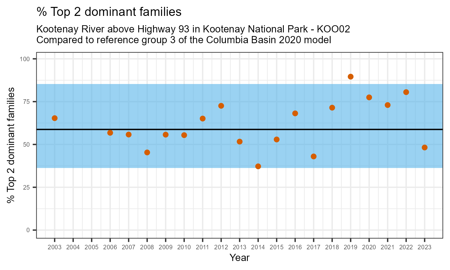 Kootenay River above Highway 93 in Kootenay National Park is a reference site. Samples from this site are used to update CABIN reference models for the Columbia River basin. Benthic macroinvertebrate community metrics were summarized for the most recent year of sampling (2023) and compared to similar reference sites in the Columbia Basin 2020 reference model.