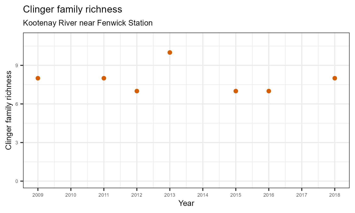 Clinger family richness counts the number of taxonomic families that tend to cling to rock surfaces. Common clingers include Simuliidae (blackflies), Ephemerellidae (mayflies), and Perlodidae (stoneflies). Clingers typically live in the gaps between rocks and cobble on streambeds. When fine sediments fill these gaps, the number of clinger families may decrease.