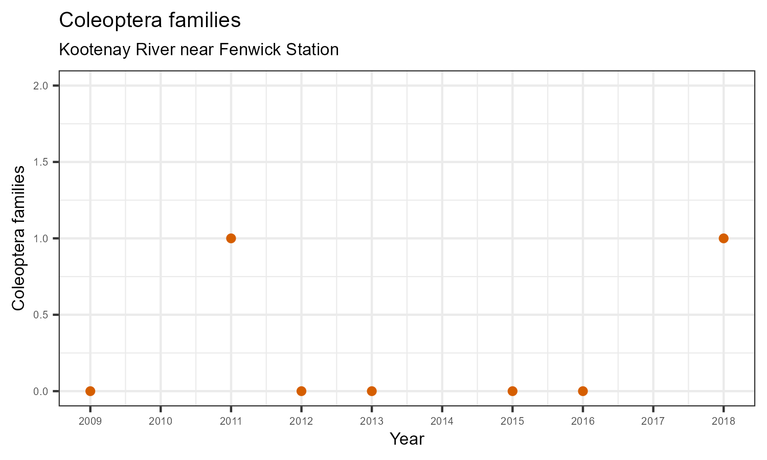Coleoptera family richness is measured by counting how many taxonomic families belong to the order Coleoptera. Coleoptera are commonly known as beetles, many of which are aquatic or semi-aquatic. They are pollution sensitive, so Coleoptera family richness may decrease in response to habitat disturbances like poor water quality.