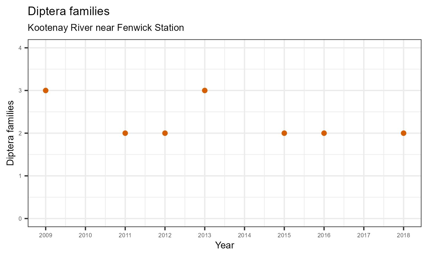 Diptera family richness is measured by counting how many taxonomic families belong to the order Diptera. Diptera are commonly known as flies. Flies tend to be pollution tolerant, so Diptera family richness may increase in response to habitat disturbances like poor water quality.