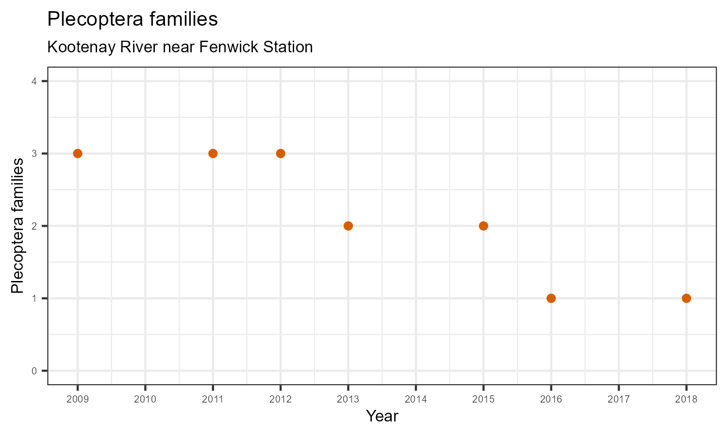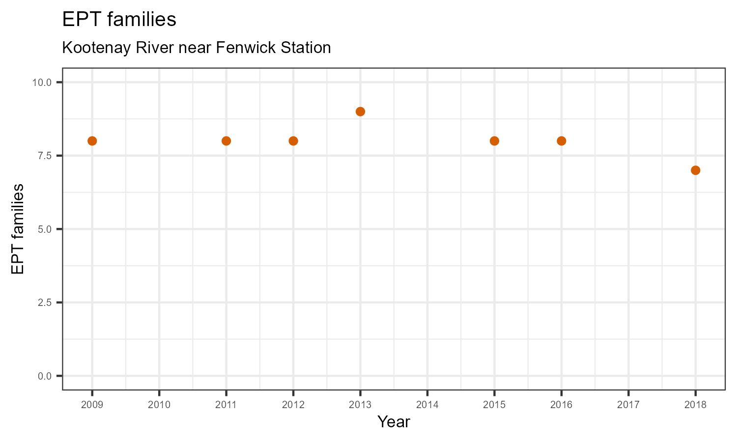 EPT family richness is measured by counting how many taxonomic families belong to one of the pollution sensitive EPT orders: Ephemeroptera (mayflies), Plecoptera (stoneflies), or Trichoptera (caddisflies). EPT family richness may decrease in response to habitat disturbances like poor water quality.