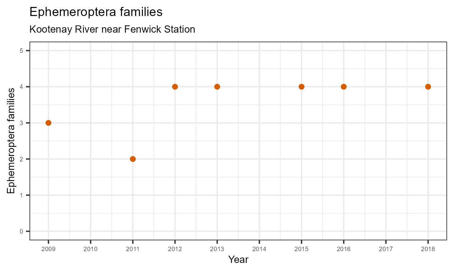 Ephemeroptera family richness is measured by counting how many taxonomic families belong to the order Ephemeroptera. Ephemeroptera are commonly known as mayflies. They are pollution sensitive, so Ephemeroptera family richness may decrease in response to habitat disturbances like poor water quality.
