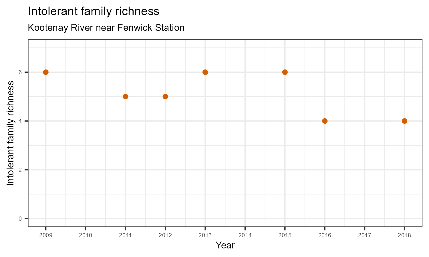 Intolerant family richness counts the number of taxonomic families that are sensitive (intolerant) to pollution, according to the Hilsenhoff Biotic Index. Intolerant family richness may decrease as water pollution increases.
