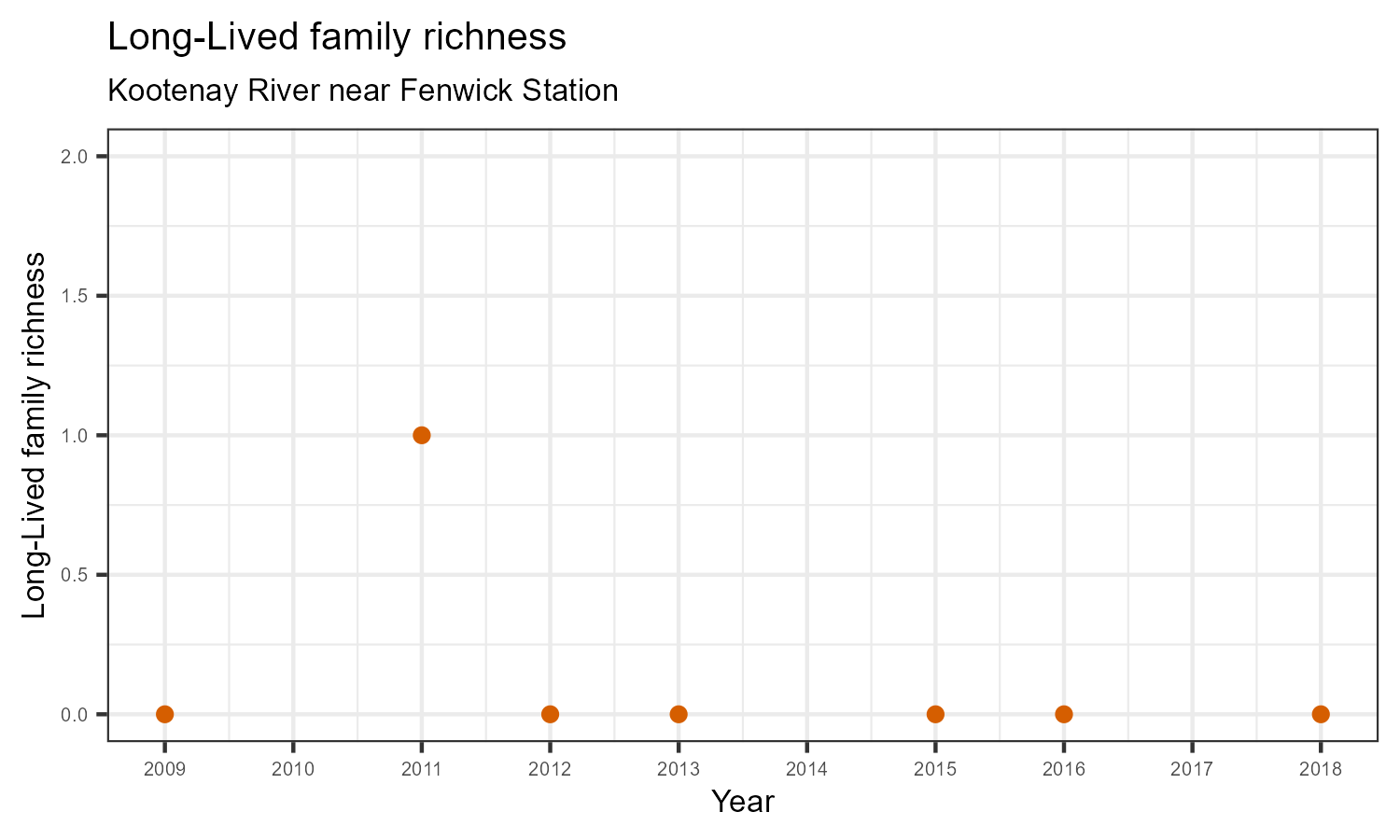 Long-lived family richness counts the number of taxonomic families that need more than 1 year to complete their life cycle. These families have been exposed to conditions in the water over a longer period. They provide information on historical and current water quality conditions. The number of long-lived families may decrease in response to habitat disturbances like poor water quality.