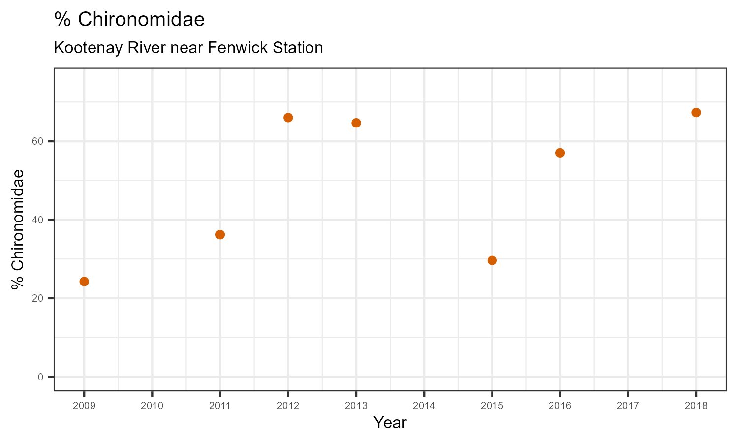 % Chironomidae is the proportion of invertebrates that belong to the taxonomic family Chironomidae. Chironomidae are non-biting midges and are often the most abundant family in a stream. Their pollution tolerance varies widely between different species.
