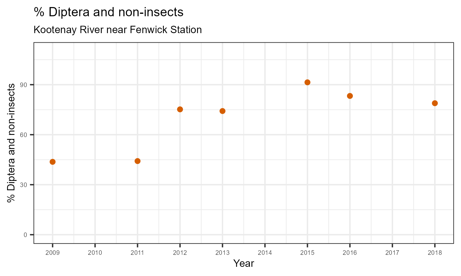% Diptera and non-insects is the proportion of invertebrates that either are not insects, or are insects in the taxonomic order Diptera. Diptera are flies, and along with non-insects they represent the more pollution tolerant members of the aquatic community. The % Diptera and non-insects may increase in response to habitat disturbances like poor water quality.