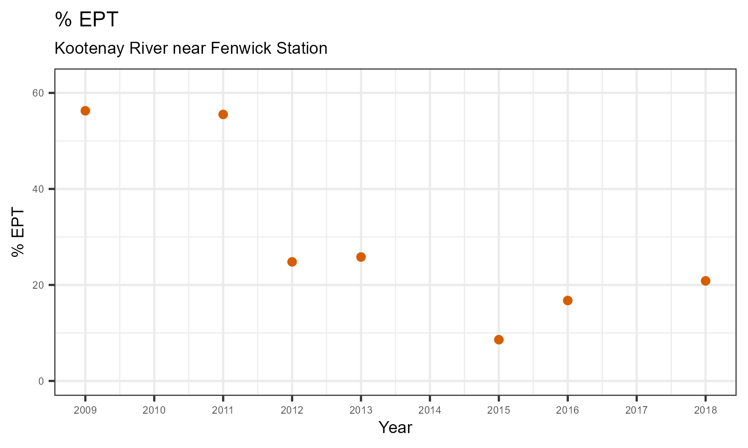 % EPT is the proportion of invertebrates that belong to one of the taxonomic orders of Ephemeroptera (mayflies), Plecoptera (stoneflies), or Trichoptera (caddisflies). These types of insects are often grouped together under the term “EPT”. They are typically the most sensitive to habitat disturbances like poor water quality.