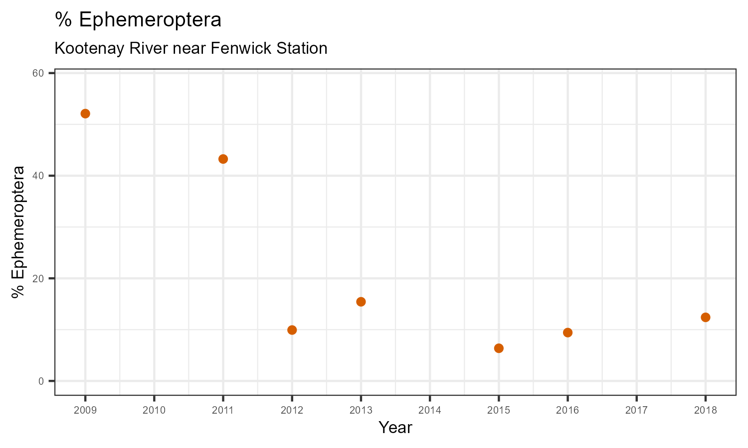 % Ephemeroptera is the proportion of invertebrates that belong to the taxonomic order Ephemeroptera. Ephemeroptera are commonly called mayflies. They are sensitive to pollution. The % Ephemeroptera may decrease in response to habitat disturbances like poor water quality.
