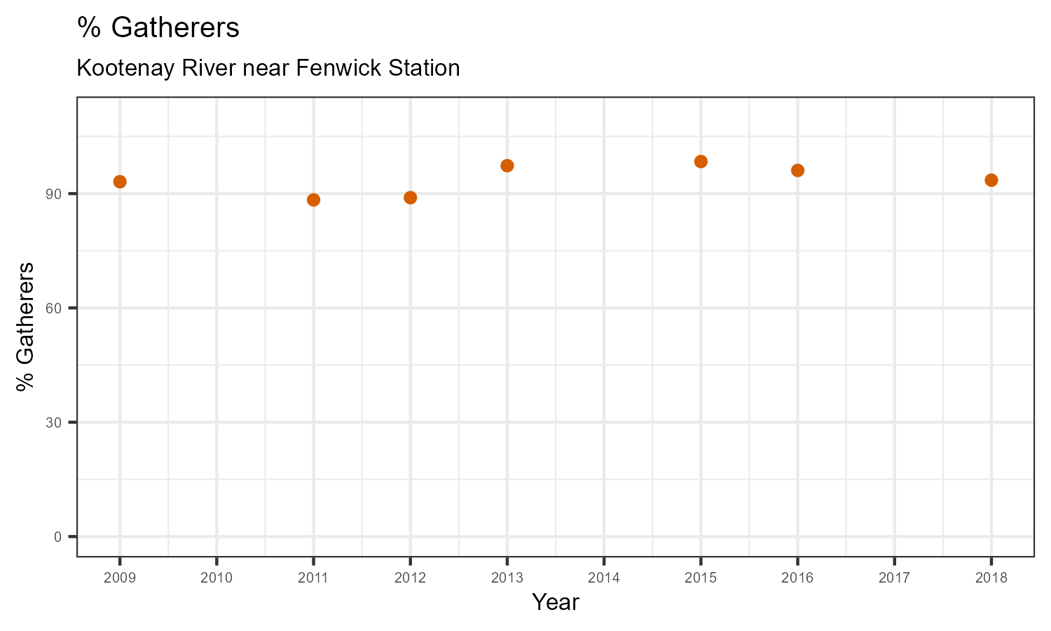 % Gatherers is the proportion of taxonomic familes present that feed primarily on fine organic matter in the water. The proportion of gatherers is expected to increase at a site in response to disturbance.