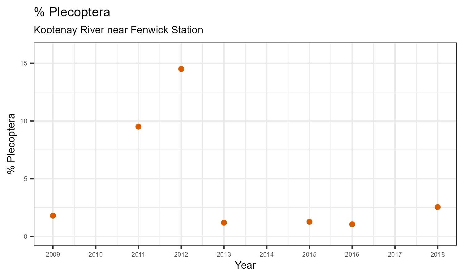 % Plecoptera is the proportion of invertebrates that belong to the taxonomic order Plecoptera. Plecoptera are commonly called stoneflies. They are sensitive to pollution. The % Plecoptera may decrease in response to habitat disturbances like poor water quality.