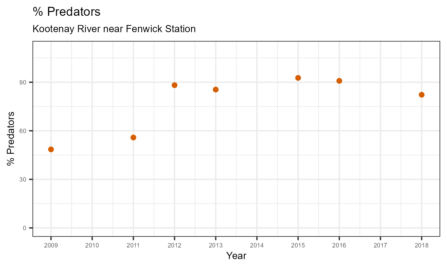 % Predators is the proportion of taxonomic familes present that feed primarily on other organisms. The proportion of predators is expected to decline at a site in response to disturbance.