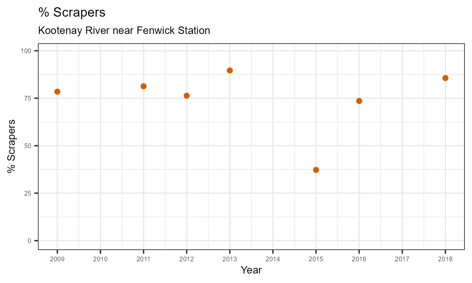 % Scrapers is the proportion of taxonomic familes present that feed by grazing on the algae growing on rocks and other underwater surfaces. The proportion of scrapers is expected to decrease at a site in response to disturbance.