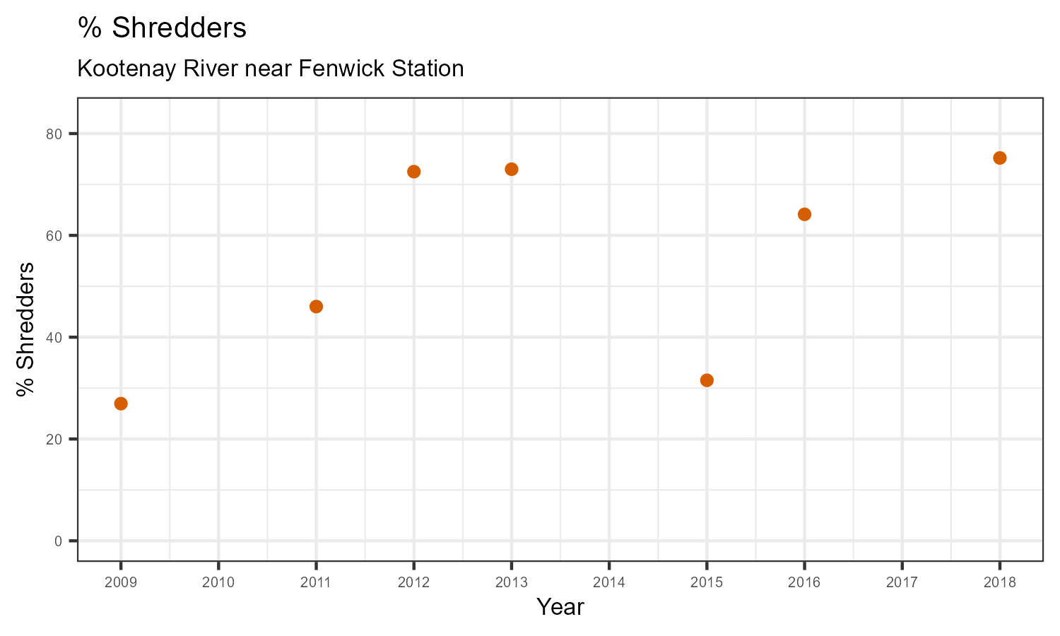 % Shredders is the proportion of taxonomic familes present that feed on leaf litter and other coarse particulate organic matter in the water. The proportion of shredders is expected to decrease at a site in response to disturbance.