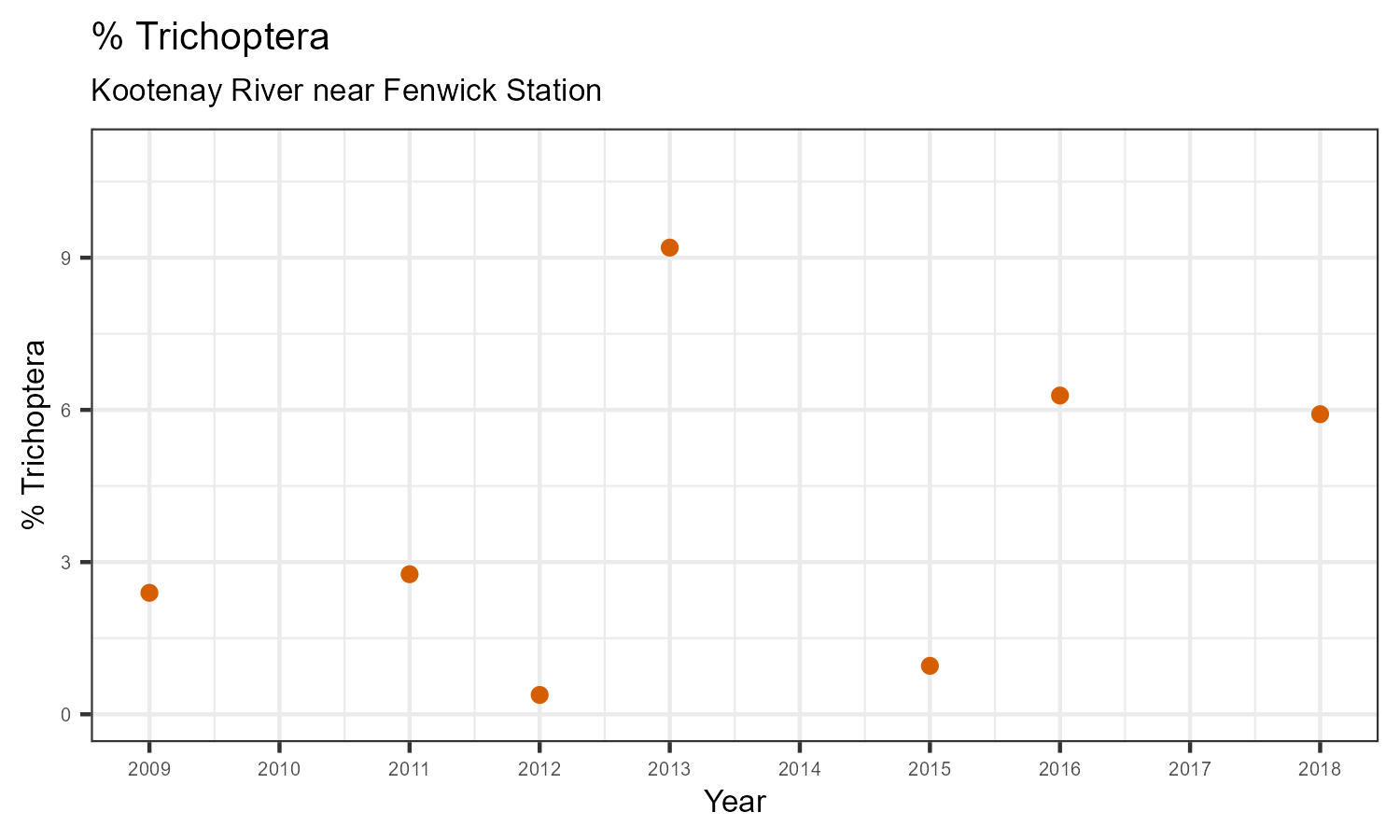 % Trichoptera is the proportion of invertebrates that belong to the taxonomic order Trichoptera. Trichoptera are commonly called caddisflies. They are sensitive to pollution. The % Trichoptera may decrease in response to habitat disturbances like poor water quality.