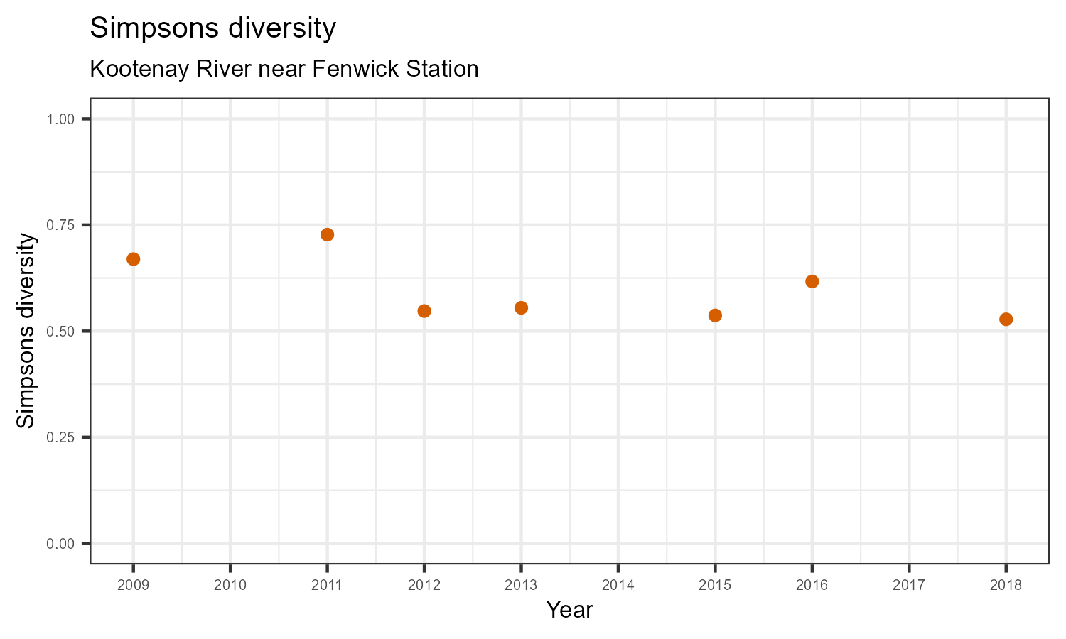 Simpson’s diversity is an index that measures the number of taxonomic families present as well as the relative number of individuals in each family. Simpson’s diversity increases as invertebrate family richness increases. It also increases when the families show similar, or balanced, abundance. Balanced, diverse communities are an indicator of a healthy ecosystem. Simpson’s diversity may decrease in response to habitat disturbance.