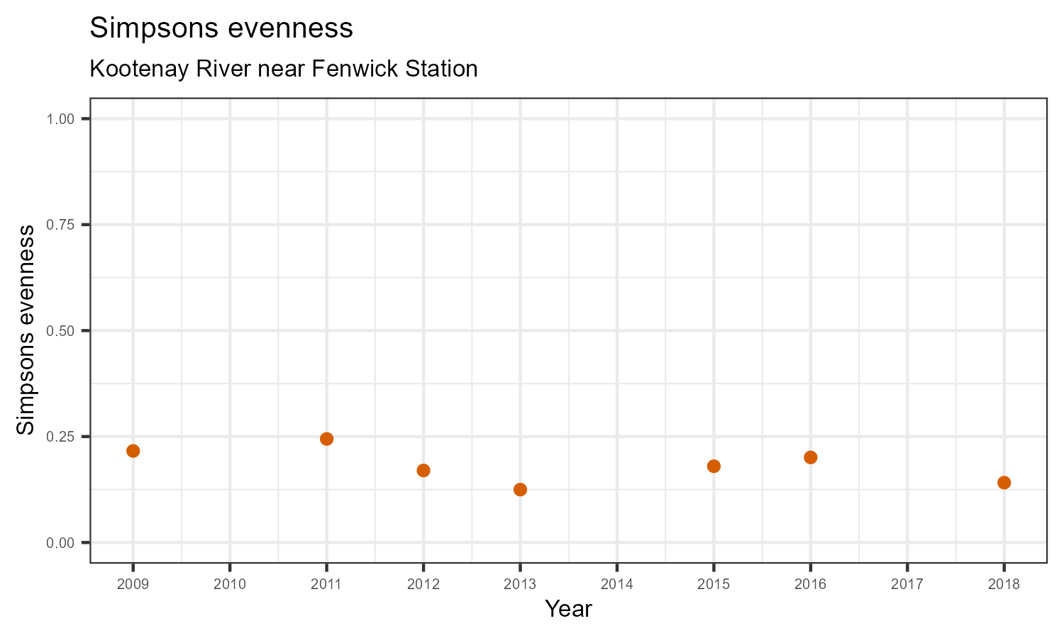 Simpson’s evenness is an index that measures whether the number of individuals in various taxonomic families is similar, or balanced. Balanced communities are an indicator of a healthy ecosystem. Simpson’s evenness may decrease in response to habitat disturbances.