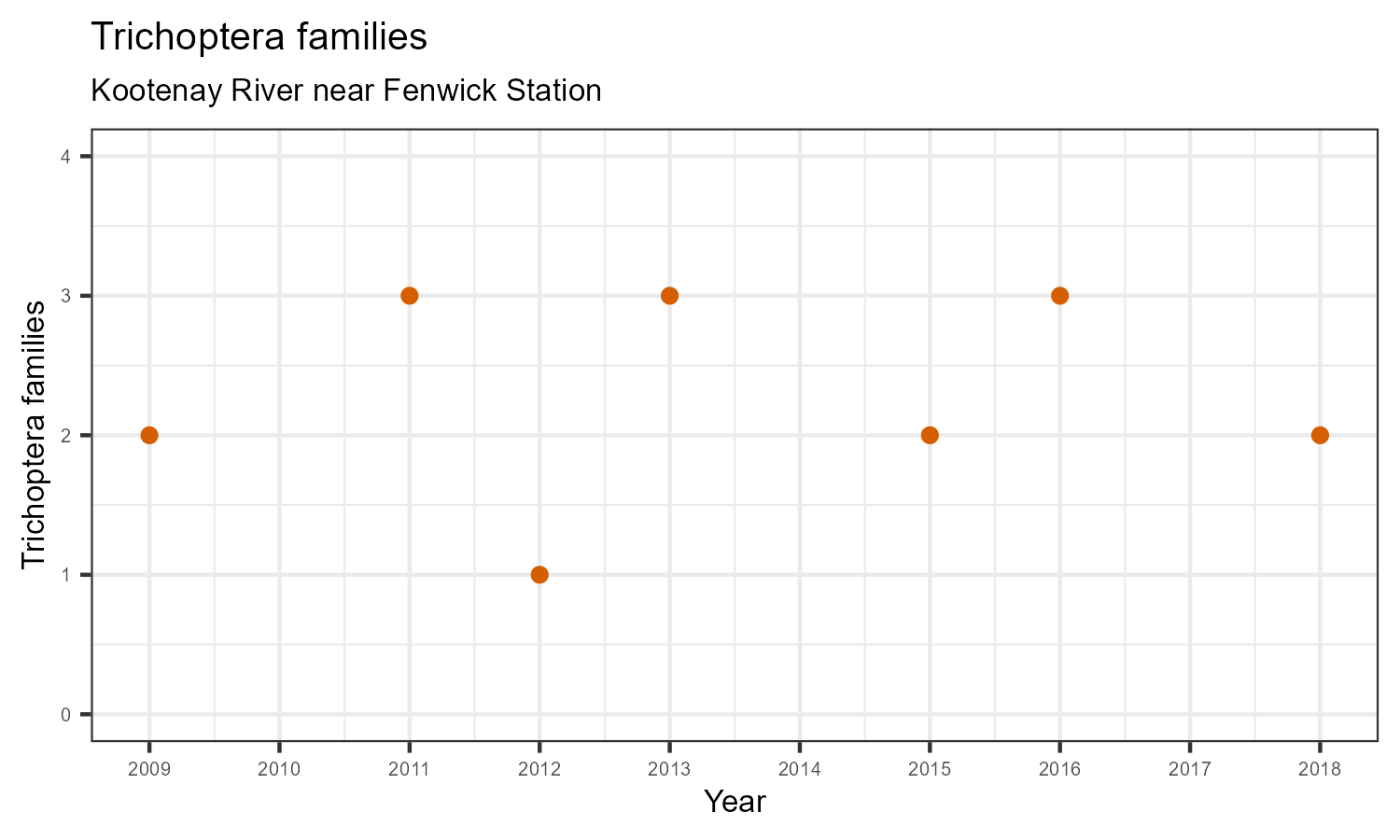 Trichoptera family richness is measured by counting how many taxonomic families in a sample belong to the order Trichoptera. Trichoptera are commonly known as caddisflies. They are pollution sensitive, so Trichoptera family richness may decrease in response to habitat disturbances like poor water quality.