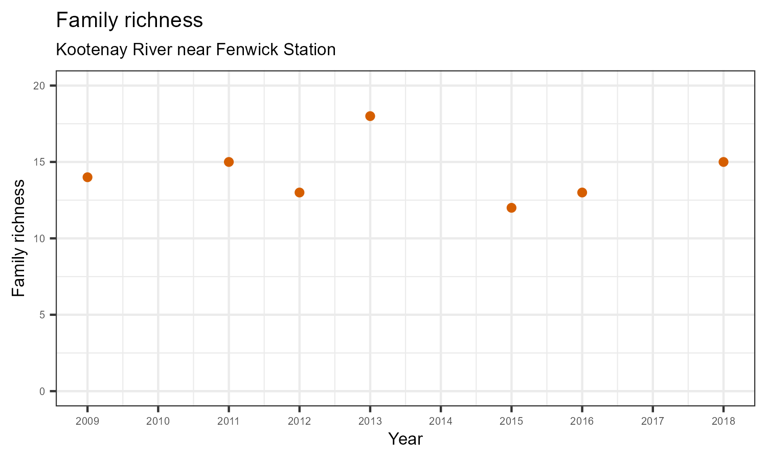 Family richness is the total number of taxonomic families identified. Family richness can decline in response to habitat disturbances or introduction of invasive species.