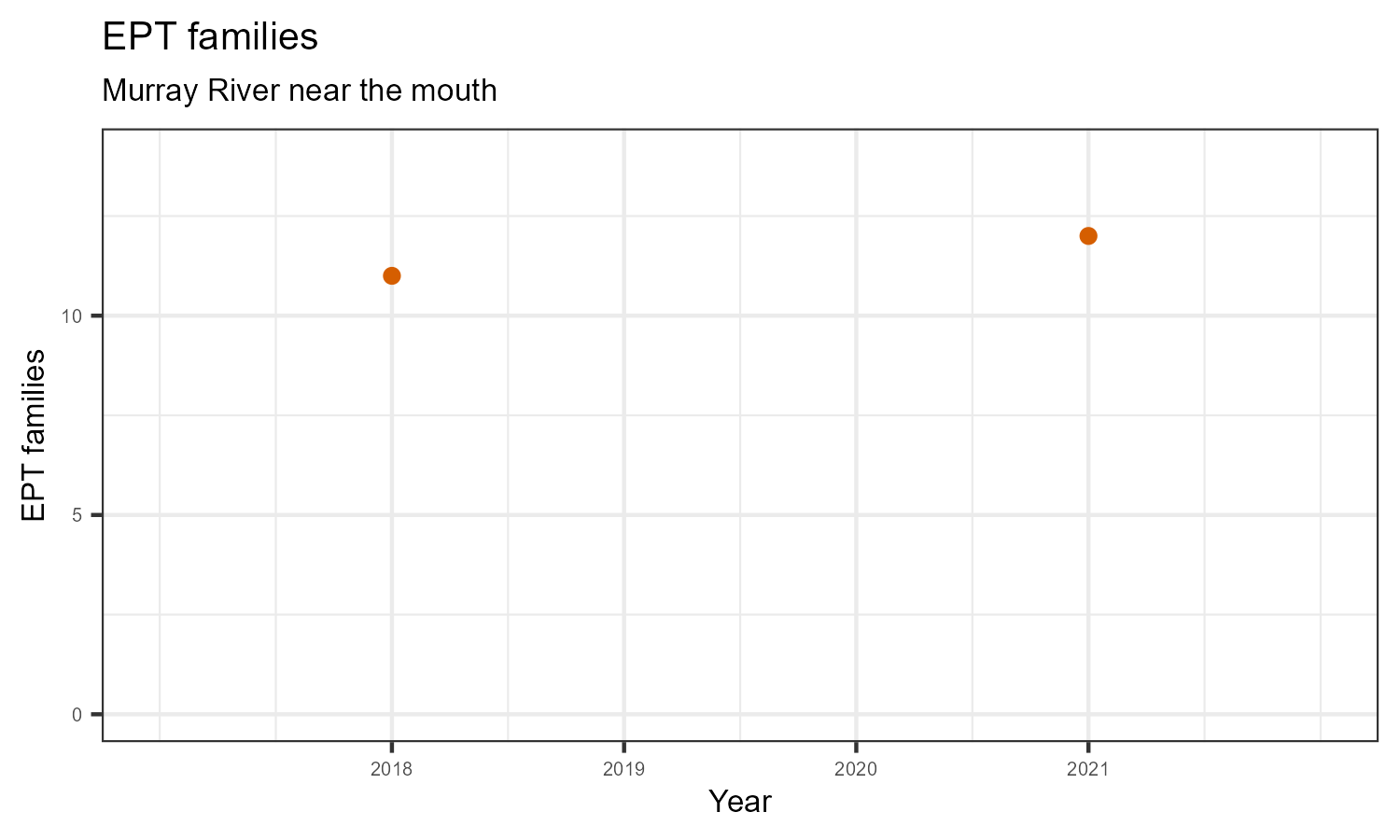 EPT family richness is measured by counting how many taxonomic families belong to one of the pollution sensitive EPT orders: Ephemeroptera (mayflies), Plecoptera (stoneflies), or Trichoptera (caddisflies). EPT family richness may decrease in response to habitat disturbances like poor water quality.