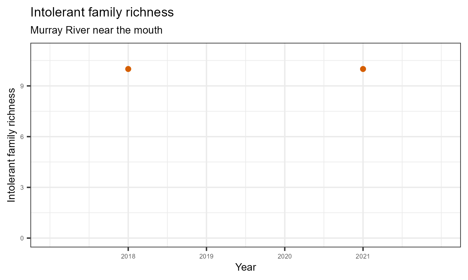 Intolerant family richness counts the number of taxonomic families that are sensitive (intolerant) to pollution, according to the Hilsenhoff Biotic Index. Intolerant family richness may decrease as water pollution increases.
