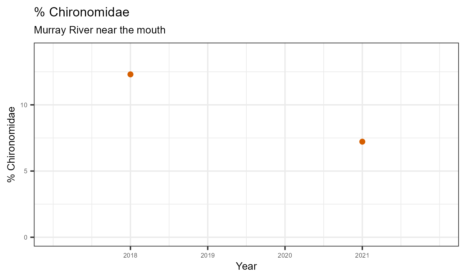 % Chironomidae is the proportion of invertebrates that belong to the taxonomic family Chironomidae. Chironomidae are non-biting midges and are often the most abundant family in a stream. Their pollution tolerance varies widely between different species.