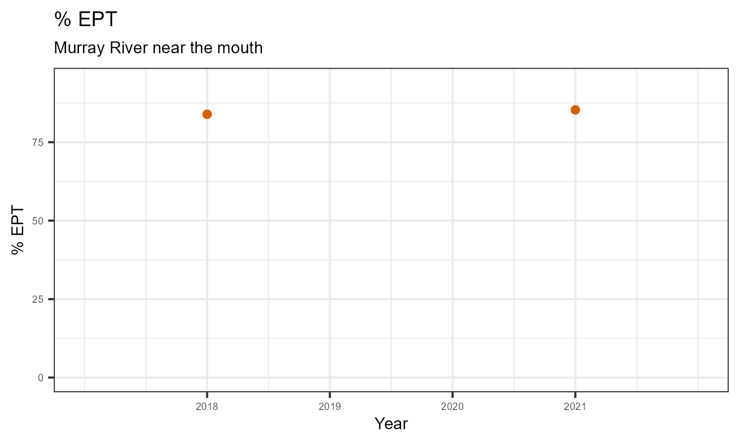 % EPT is the proportion of invertebrates that belong to one of the taxonomic orders of Ephemeroptera (mayflies), Plecoptera (stoneflies), or Trichoptera (caddisflies). These types of insects are often grouped together under the term “EPT”. They are typically the most sensitive to habitat disturbances like poor water quality.