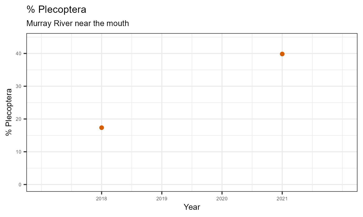 % Plecoptera is the proportion of invertebrates that belong to the taxonomic order Plecoptera. Plecoptera are commonly called stoneflies. They are sensitive to pollution. The % Plecoptera may decrease in response to habitat disturbances like poor water quality.