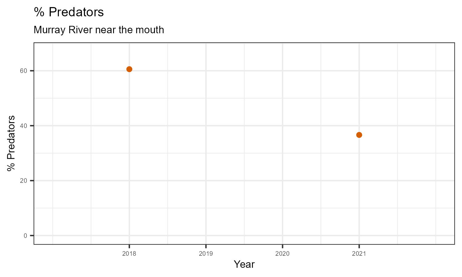 % Predators is the proportion of taxonomic familes present that feed primarily on other organisms. The proportion of predators is expected to decline at a site in response to disturbance.