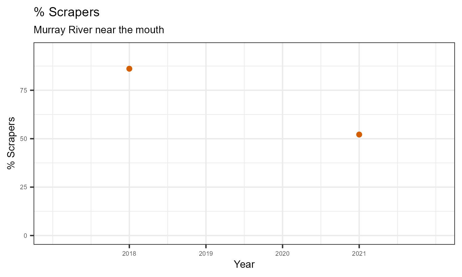 % Scrapers is the proportion of taxonomic familes present that feed by grazing on the algae growing on rocks and other underwater surfaces. The proportion of scrapers is expected to decrease at a site in response to disturbance.